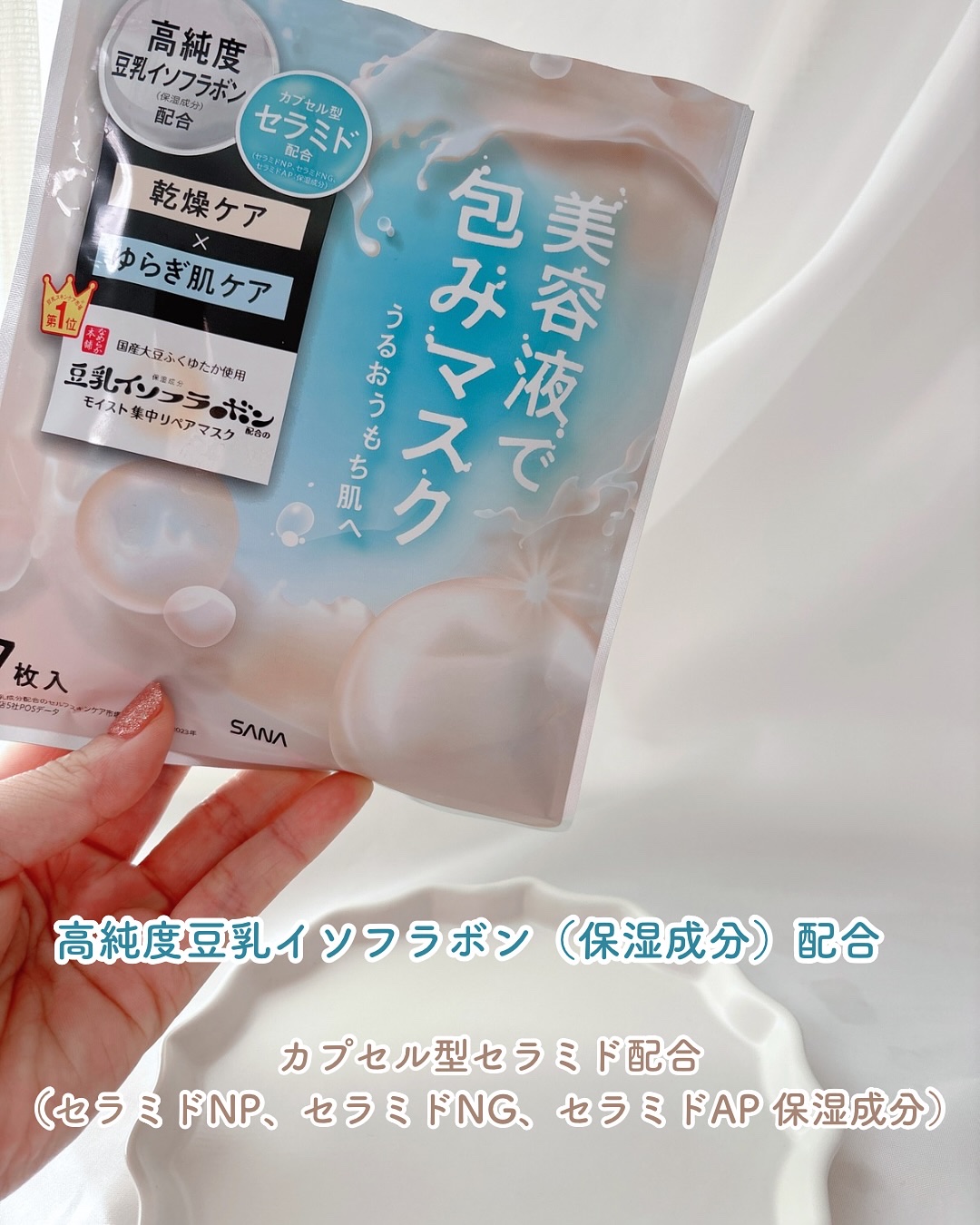 - ゆらぎがちなお肌を整えてうるおい肌へ導く 7 枚入りのマスクです。高純度豆乳イソフラボン※2 とふくゆたか使用の豆乳発酵液※2 、大豆由来の美容成分※4 でカプセル化した 3 種のセラミド※5 を贅沢配合した、まるで豆乳のような 美容液で包みます。乾燥を防ぎ「守り」のケアを実現。うるおいキープ成分(グリセリルグルコシド、パンテノール、エクトイン/保湿成 分)、整肌成分(グリチルリチン酸2K、アラントイン)配合で、うるおいを保ち、なめらかな素肌に。お肌を包み込む、ぴたっと密着シート を採用。美容液をたくわえて浸透※6 させる高密着の 3 層構造シートとたっぷり 150g の美容液で、お肌をうるおいで満たします。 ※2 保湿成分 ※3 N-ステアロイルジヒドロスフィンゴシン(保湿成分) ※4 水添レシチン(保湿成分) ※5 セラミド NP、セラミド NG、セラミド AP(保湿成分) ※6 角層まで