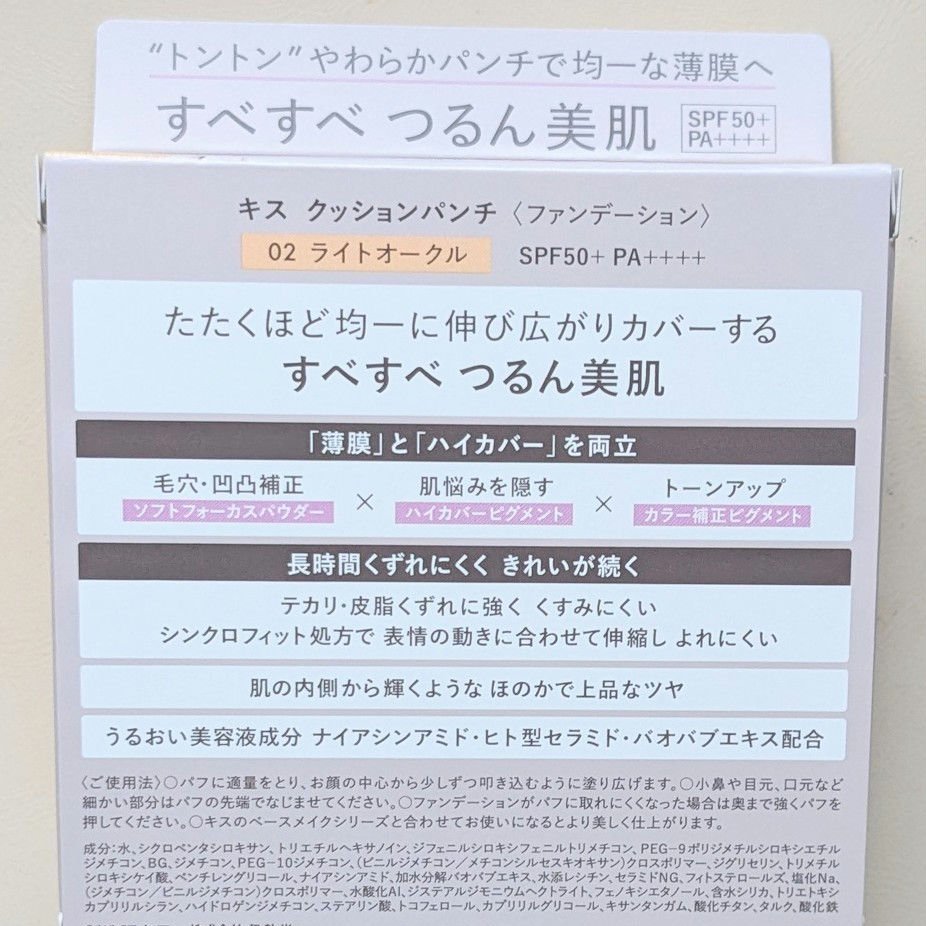 - “トントン”やわらかパンチで均一な薄膜へ すべすべ つるん美肌クッションファンデ ハイカバーなのに薄膜 ◇ソフトフォーカスパウダー・ハイカバーピグメント・カラー補正ピグメントを配合。 「薄膜」と「ハイカバー」の両立を叶えます。 たたくほど均一に伸び広がる ◇やさしくトントン叩くとやわらかく伸びて肌に隙間なく広がり、厚塗り感のない薄膜で均一な肌に仕上げます。 ◇キメ細かく、高密着でお肌の毛穴・シワ・凹凸をなめらかで均一に整えるもちふわ素材の独自パフを採用。 絶妙な厚みで肌にのせやすく、目・小鼻周りを仕上げやすいドロップ型。 長時間くずれにくい! ◇テカリや皮脂くずれを長時間防止。表情に合わせて伸縮する「シンクロフィット処方」で、シワだまりやひび割れを防いできれいな仕上がりが続きます。 トレンド感のあるほのかで上品なツヤ ◇内側から輝いているような自然なツヤを纏った肌に。 美容液成分配合 ◇ナイアシンアミド・バオバブエキス・ヒト型セラミド(うるおい成分)配合。 日常紫外線をカット SPF50+ PA++++ 先行発売 2025年2月28日(金)