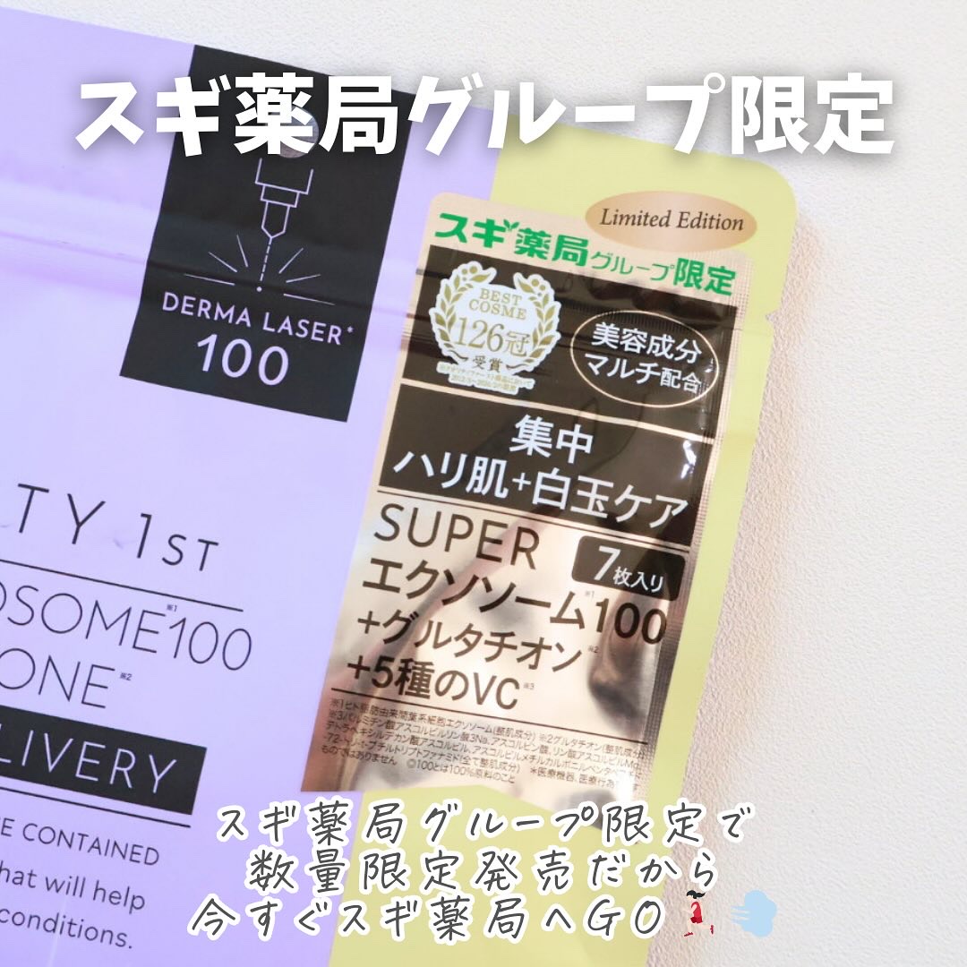 スギ薬局グループ限定販売な上に数量限定だから注意! 話題の美容成分である「エクソソーム」「グルタチオン」「ビタミンC」「ナイアシンアミド」「アルブチン」などマルチ配合。 シートが肌にぴったり密着してたっぷりのうるおいをチャージしてくれる。