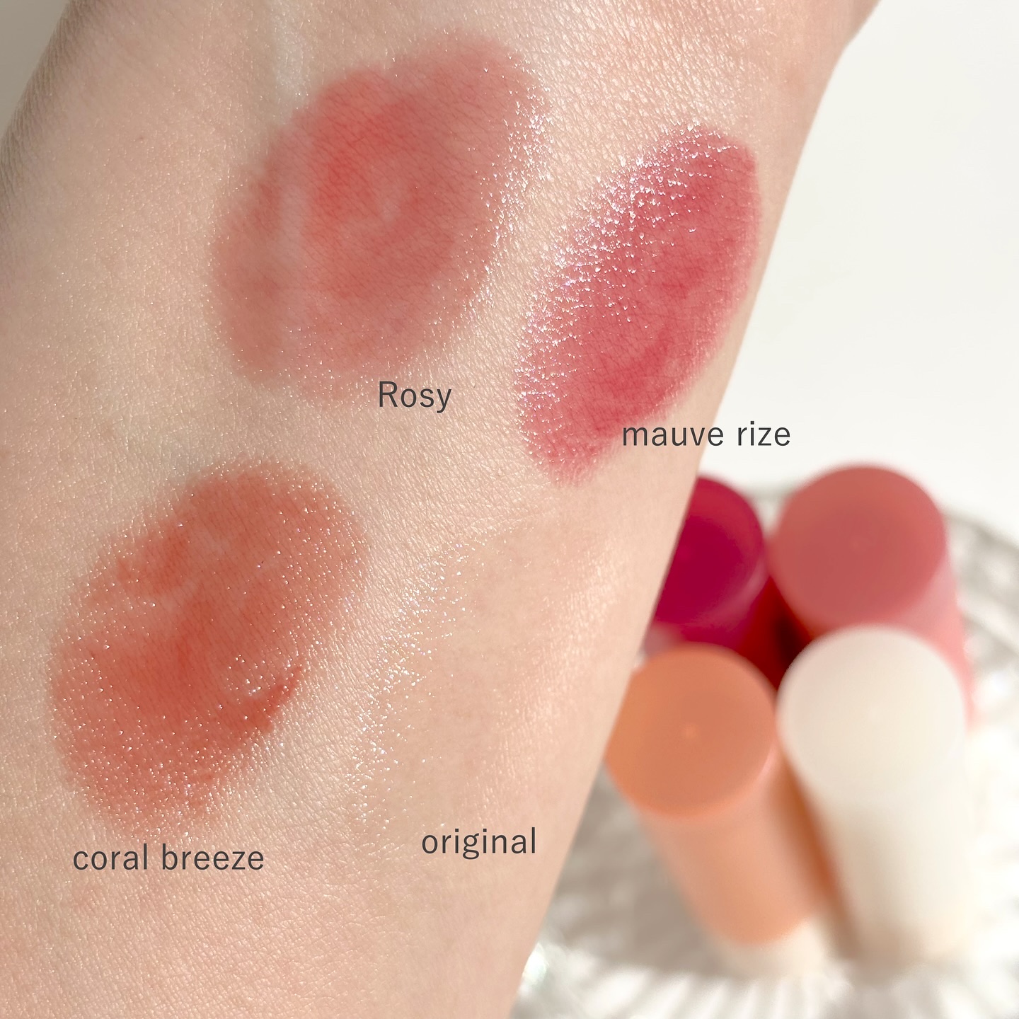 するっととろけてしっとりとした使用感🤍 べたべたした感じはなく使いやすいテクスチャー! リップバームだけどしっかり発色してくれて塗り重ねることで調整もできる◎ イエベの私はコーラルブリーズが1番好みですがロージーもモーブライズも馴染みのいいカラーです🩷💛