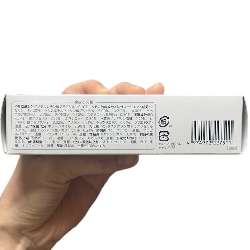 - <有効成分> 、肌あれ防止成分 グリチルレチン酸ステアリル0.10%、<その他の成分> 、油性エモリエント成分 ワセリン10.00%、〃 トリ2-エチルヘキサン酸グリセリル5.00%、〃 スクワラン4.00%、〃 ベヘニルアルコール3.75%、〃 ジメチコン0.30%、〃 ステアロイル乳酸Na0.30%、〃 大豆油0.01%、保湿成分 BG7.57%、〃 濃グリセリン7.56%、〃 D-マンニット0.50%、〃 水素添加大豆リン脂質0.20%、〃 ヒアルロン酸ナトリウム(2)0.02%、〃 グリシン0.01%、〃 チョウジエキス0.01%、〃 シソエキス(1)適量、皮フ保護成分 ボラージオイル2.99%、乳化剤 ペンタステアリン酸デカグリセリル0.95%、〃 縮合リシノレイン酸デカグリセリル0.21%、防腐剤 メチルパラベン適量、〃 プロピルパラベン適量、成分の酸化防止剤 d-δ-トコフェロール適量、〃 BHT適量、〃 トコフェロール適量、基剤 精製水全量を100%とする