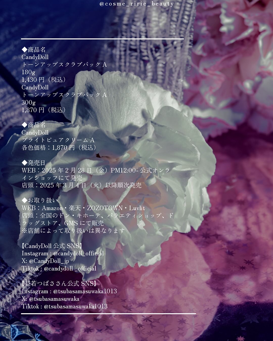 全身まるごと透明感白肌になれちゃう商品を紹介します🕊️✨ ✔ブライトピュアクリームA(ホワイト・ラベンダー) ボディ用のトーンアップUVクリームです。SPF50+ PA++++と、しっかりと日焼け対策もしつつ全身をトーンアップしてくれます。 ✔トーンアップスクラブパックA 300g トーンアップしたい部分に塗って洗い流すだけ!2分で透明感が仕込めるボディ用の洗い流しパックです。