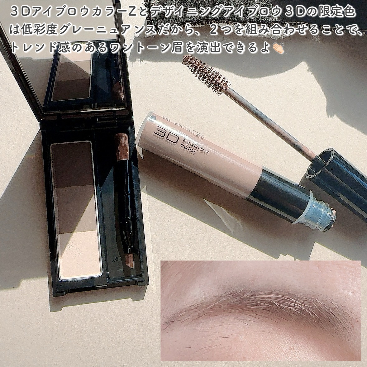 3DアイブロウカラーZの限定色で淡く色づく#低温グレージュ眉 が実現! ふんわり立体感のある眉が実現します。肌に馴染むエアリーなマット質感で、Wブラシで細かいラインからふんわり仕上げまで叶えます。 自眉の「黒」を抑える発色で軽やかなパウダリー仕上がりが期待できます♪地肌につきにくい小回りブラシも嬉しいポイントです◎