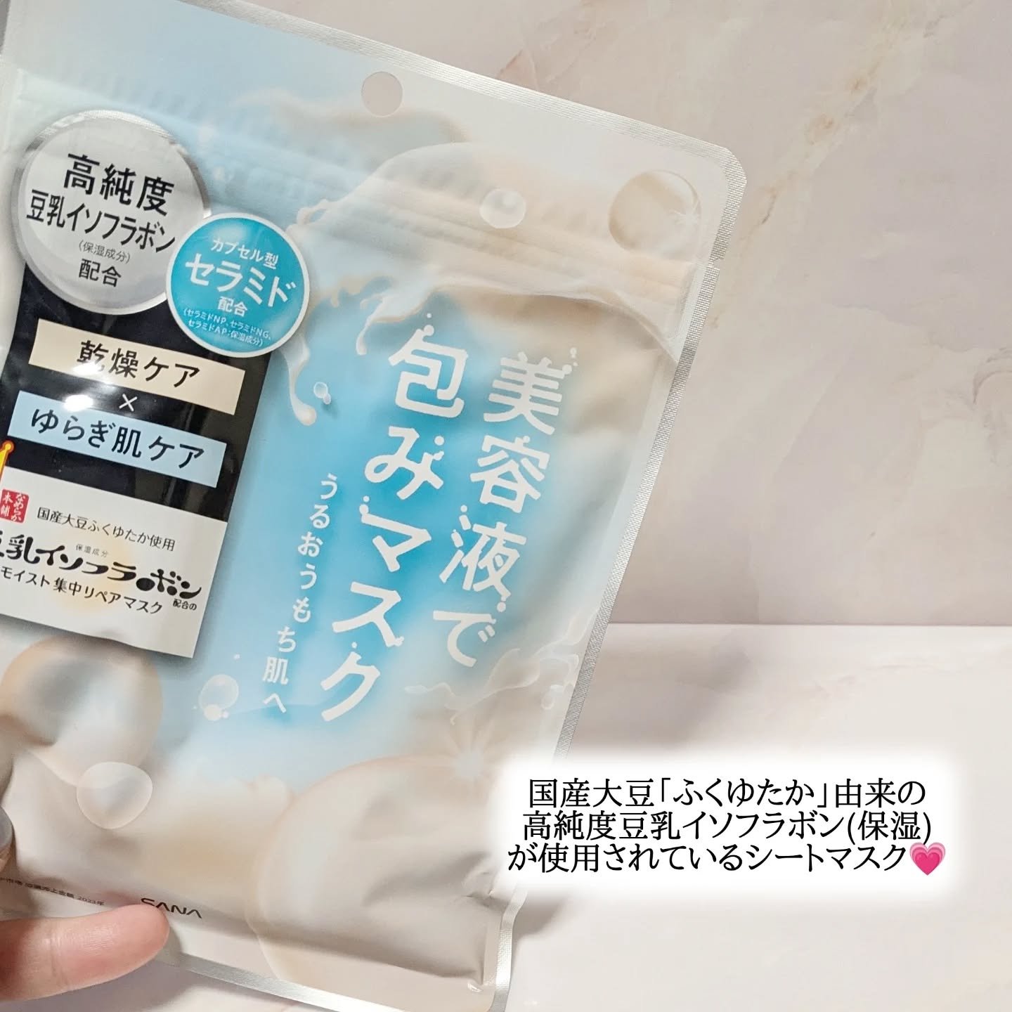 - ゆらぎがちなお肌を整えてうるおい肌へ導く 7 枚入りのマスクです。高純度豆乳イソフラボン※2 とふくゆたか使用の豆乳発酵液※2 、大豆由来の美容成分※4 でカプセル化した 3 種のセラミド※5 を贅沢配合した、まるで豆乳のような 美容液で包みます。乾燥を防ぎ「守り」のケアを実現。うるおいキープ成分(グリセリルグルコシド、パンテノール、エクトイン/保湿成 分)、整肌成分(グリチルリチン酸2K、アラントイン)配合で、うるおいを保ち、なめらかな素肌に。お肌を包み込む、ぴたっと密着シート を採用。美容液をたくわえて浸透※6 させる高密着の 3 層構造シートとたっぷり 150g の美容液で、お肌をうるおいで満たします。 ※2 保湿成分 ※3 N-ステアロイルジヒドロスフィンゴシン(保湿成分) ※4 水添レシチン(保湿成分) ※5 セラミド NP、セラミド NG、セラミド AP(保湿成分) ※6 角層まで