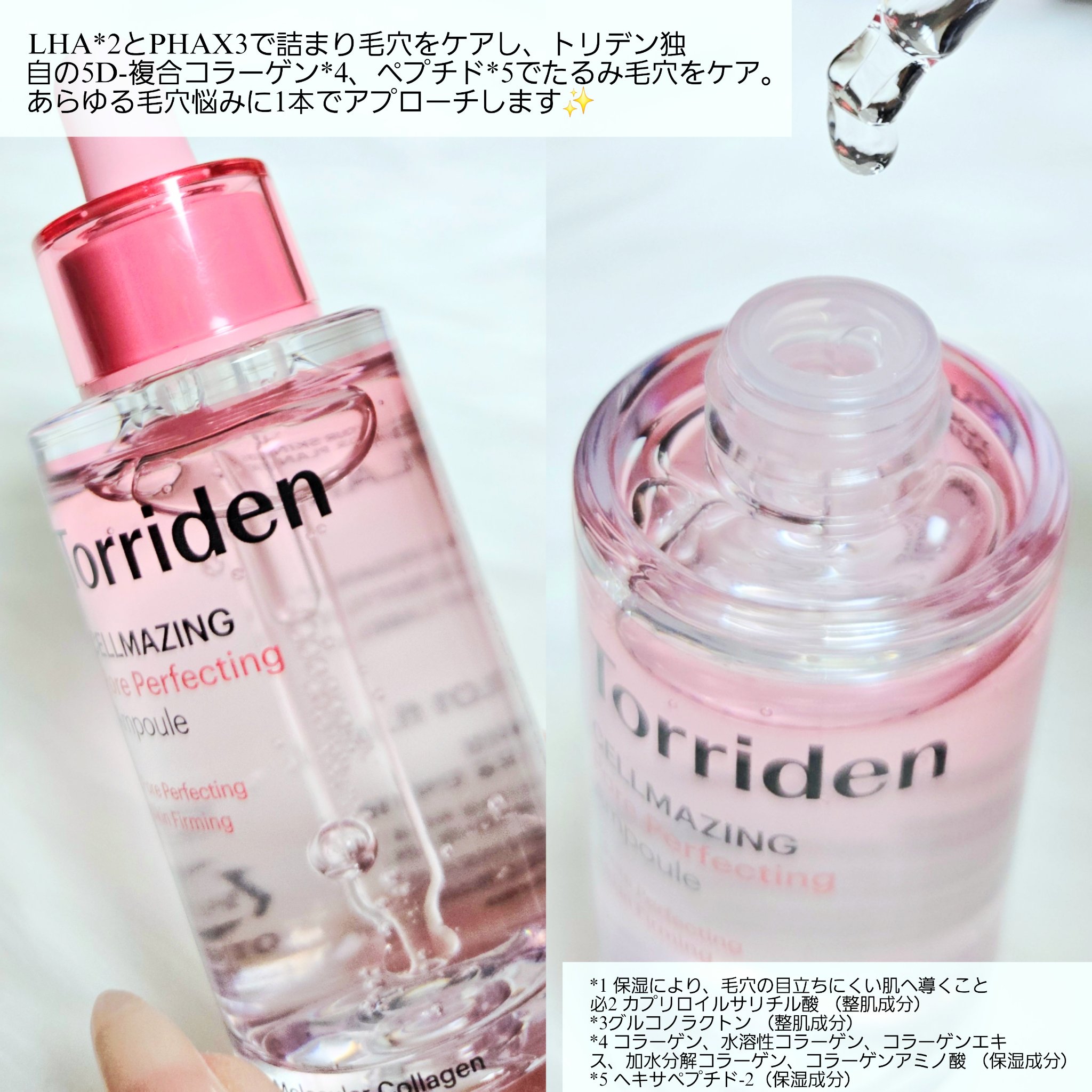 毛穴ケア特化型美容液 LHAとPHAで詰まり毛穴をケアし、トリデン独自の5D-複合コラーゲン、ペプチドでたるみ毛穴をケア。あらゆる毛穴悩みに1本でアプローチ✨✨ ナイアシンアミドで気になる毛穴周りの肌を整え、ヒアルロン酸Naが乾燥で目立つ毛穴をしっとり仕上げる💓 上下分かれた2ピース仕様かつエンボス加工を施すことで、高密着でエッセンスをお肌の角質層まで届けてくれるよ💫