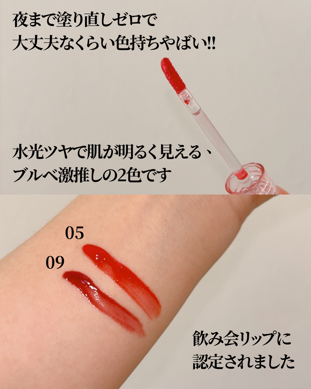 | 軽いテクスチャで透き通るように輝く水光ティント。このリップ、色持ちが本当に良い🥺♡ | 詳細を見る | ||