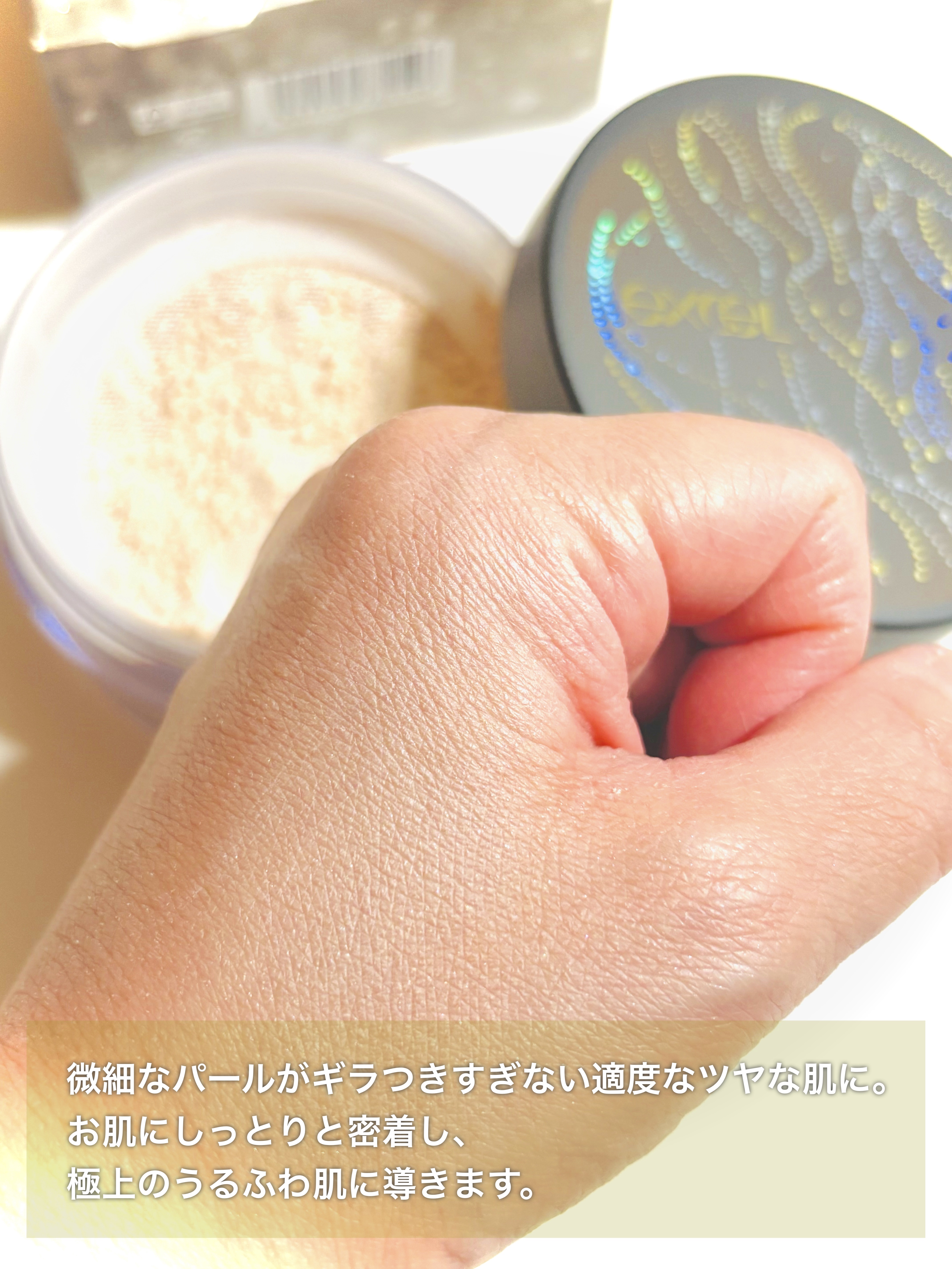 - 【限定発売】 ※10月22日よりエクセル公式オンラインショップ及びAmazonにて先行販売 7色パールでふわツヤ肌 美肌演出効果にこだわった、プレミアムなスキンケアパウダー 1.アミノ酸コーティング処方 ベースとなるパウダーをアミノ酸*1でコーティング。 お肌にしっとりと密着し、上質なうるふわ肌に。 2.セラミド内包パウダー*2 お肌のうるおいバリアをサポートし、乾燥から守ります。 3.肌色補正 ◆パウダー ◆メイクアップ効果 多面体パウダーが光を乱反射させ、お肌の明るい印象UPを演出。 ○シルクパウダー*3:毛穴やお肌の凹凸をカバー。 ○皮脂吸着効果:テカリを防ぎ、つけたての仕上がりが持続。 7色の微細パールで発光するようなツヤ肌に ピンク パープル ブルー グリーン オレンジ ゴールド シルバー シリーズ最多*4 10種の美容液成分*5贅沢in(すべて保湿) クリアな仕上がりが持続! 皮脂に触れてもくすみにくいパウダーを配合。 時間が経っても透明感のある美しいお肌をキープ。 伸縮ネット容器採用 上から押さえるだけでパフに均一にパウダーが取れます。 ふんわり贅沢な最高級*6パフ オールシーズン用 <01 ピーチベージュ> セミマットなうるふわ肌 美肌演出効果にこだわった、プレミアムなスキンケアパウダー <02 ピーチグロウ> 7色パールでふわツヤ肌 美肌演出効果にこだわった、プレミアムなスキンケアパウダー *1 ジラウロイルグルタミン酸リシンNa(保湿) *2 コメヌカスフィンゴ糖脂質、コメヌカ油、シクロデキストリン(すべて保湿) *3 シルク *4 サナ エクセル エクストラリッチパウダーシリーズにおいて *5 リピジュア(ポリクオタニウム-51)、ビタミンC誘導体(リン酸アスコルビルMg)、ビタミンA誘導体(パルミチン酸レチノール)、ビタミンB(ピリドキシンHCl)、ビタミンE誘導体(トコフェリルリン酸Na)、パンテノール、エクトイン、スクワラン、アルガンオイル(アルガニアスピノサ核油)、ホホバ種子油 *6エクセルブランド内において