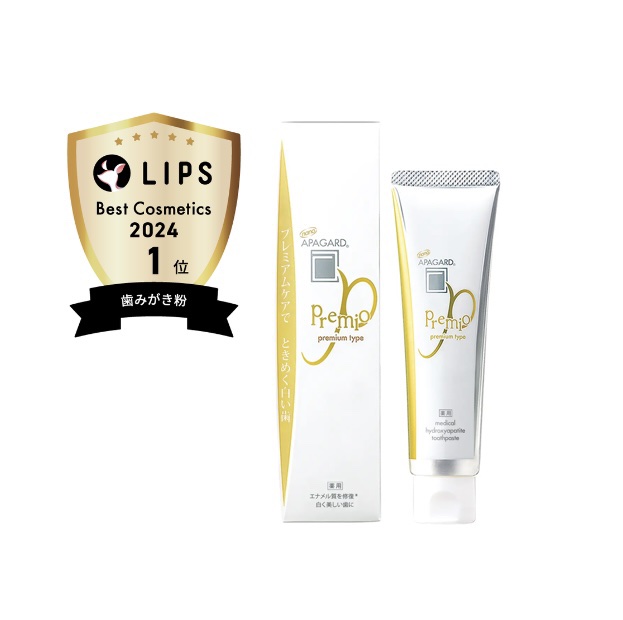 - 【医薬部外品】 独自成分「薬用ハイドロキシアパタイト」がエナメル質を整えてむし歯を予防。アパガードはエナメル質の健康を保つことで自然な白い歯に導く美白歯みがきブランド。アパガードプレミオは「薬用ハイドロキシアパタイト」を高配合(スタンダードタイプ比)。プレミアムケアでときめく白い歯に。 <ライトミント> ●サンギ独自の薬用成分ナノ粒子「薬用ハイドロキシアパタイト」を高配合したプレミアムタイプ。※Mプラス、スモーキン比 ●歯の再石灰化率、白色度もアップ。 ●歯垢を吸着除去し、歯のエナメル質の目に見えない傷を埋め、ミネラル欠損部(初期むし歯)を再石灰化するナノ<mHAP>の3つの働きで、むし歯を予防。 ●パール成分(加水分解コンキオリン液)配合。 <エクストラミント> ●強めのミントがお好みの方におススメ!ミント強めの「エクストラミント」フレーバー。 ●サンギ独自の薬用成分ナノ粒子「薬用ハイドロキシアパタイト」を高配合したプレミアムタイプ。※Mプラス、スモーキン比 ●歯垢を吸着除去、エナメル質表面の目に見えない傷を埋めてなめらかに、エナメル質から溶け出したミネラルを補給(再石灰化)する、という薬用ハイドロキシアパタイトの3つの作用でむし歯を予防。 ●パール成分(加水分解コンキオリン液)を追加したブライトニング処方