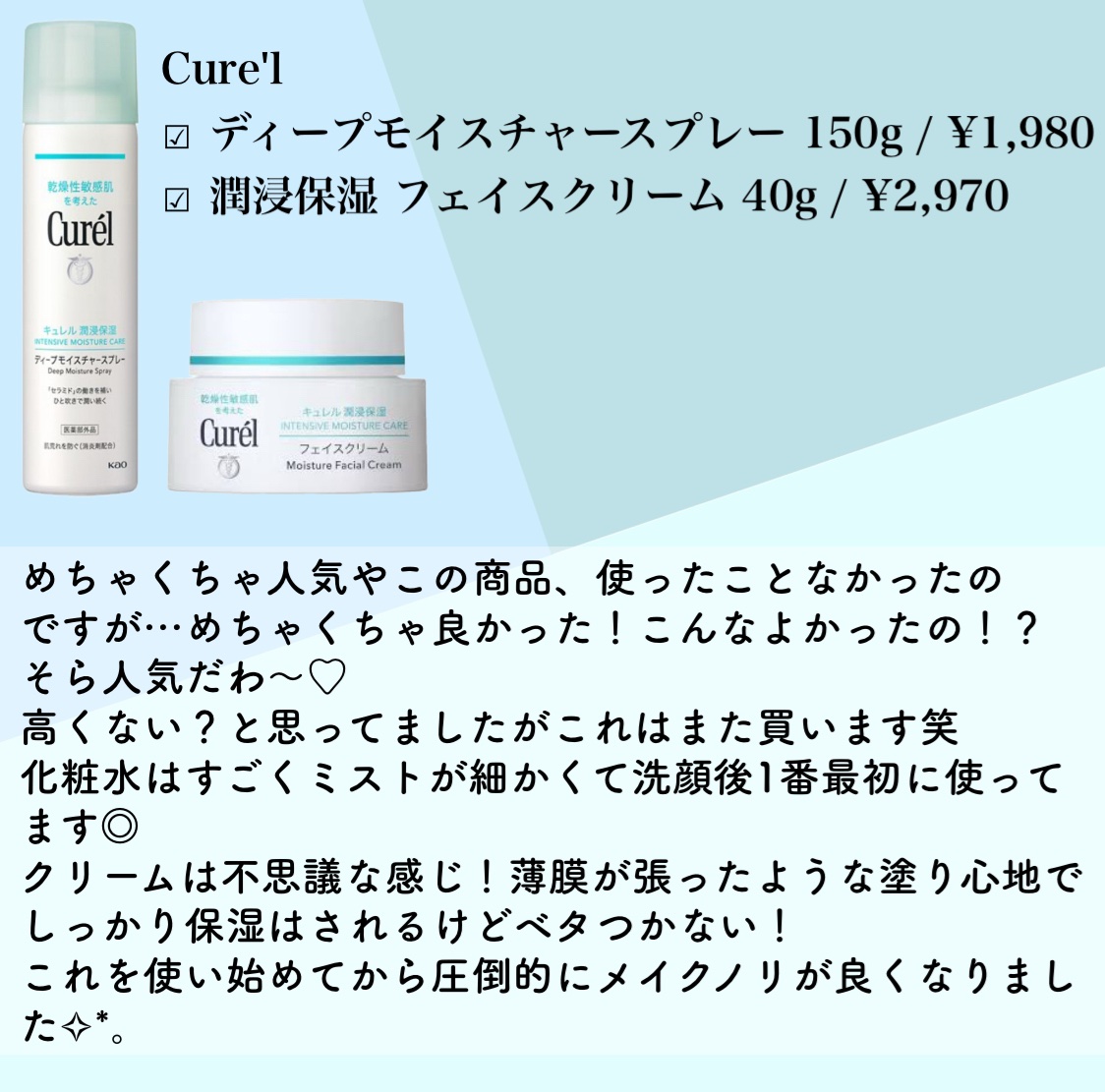 花王さまからいただきました❤︎キュレル潤浸保湿フェイスクリーム40gディープモイスチャースプレー60g医薬部外品💫💫ずっと人気のキュレルのスキンケア🩷敏感肌の人にも優しいのありがたい🥺潤浸保湿フェイスクリーム軽めなテクスチャーでサラッと軽い!...