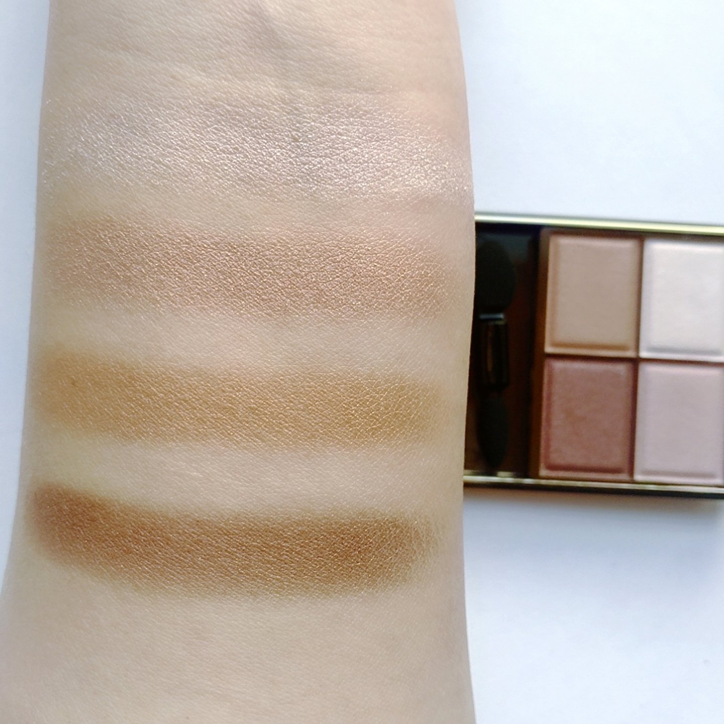 プチプラのクオリティじゃないっ!! 発売前からチェックしていたけれど、ここまで可愛いとは…😆 絶妙カラーで目もとのくすみを飛ばして*明るい印象に🩷 横割りグラデーションでメイクし、立体感をより出したかったので最後に1番左のカラーを上まぶたの真ん中と涙袋にのせています🙆 肌馴染みも良くて粉飛びも感じにくかったです💕 ブラウンの方も店頭に出てたら買おうかな💓
