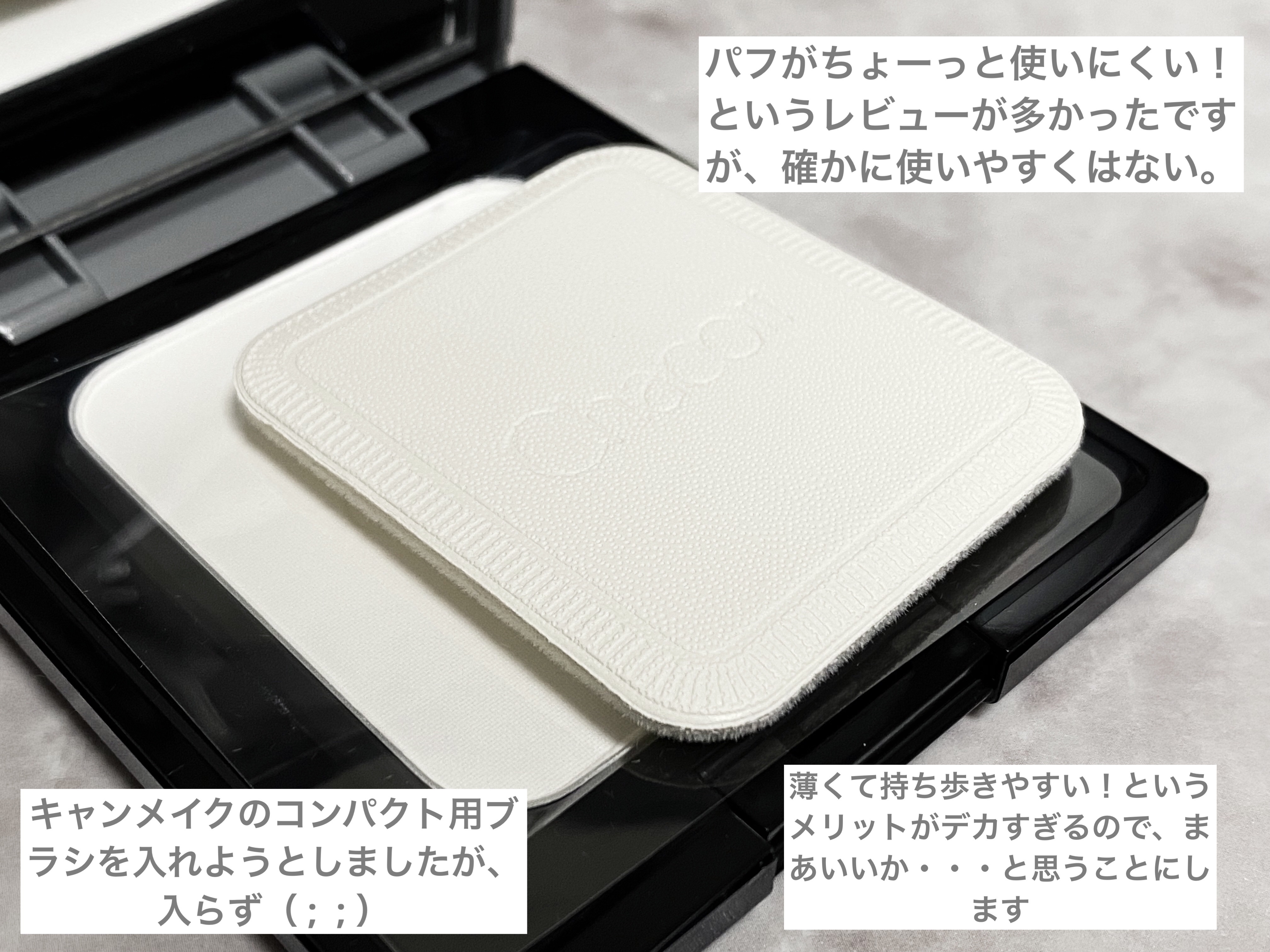 しっとりしてるので、乾燥しないところ。 薄づきのため小皺が強調されない。目元や部分のお直しにちょうどいいパフとサイズ感。 毎日全顔直す人は別途ファンデブラシを持ち歩くのをお勧めします 飲み会の前にお直しをした際、2時間半経って帰る頃になっても乾燥しませんでした。