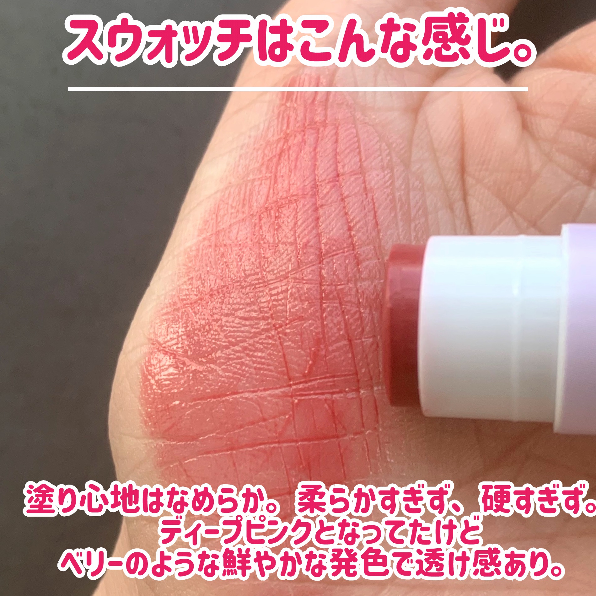 青みを感じる深みのあるピンク。ブルベさん寄りかと思いきや、馴染みが良い粘膜カラーという感じで万人向きかも◎ ほんのり甘い香りがついているので、香りに敏感な方はご注意を☝️ リップのツヤ出しや塗り直しなどには使いやすいと思います。