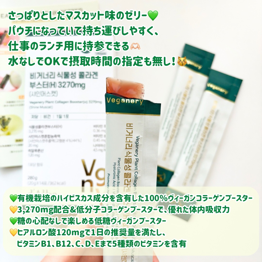 さっぱりと美味しいシャインマスカット味のコラーゲンゼリー。砂糖の代わりにシャインマスカット濃縮液を使用することで自然な甘みに。 毎日美味しく美肌サポートをしてくれるアイテム✨ 柔らかめのちゅるんと食べられるゼリー。冷やして食べると、さらに美味しいのでおすすめ🩷