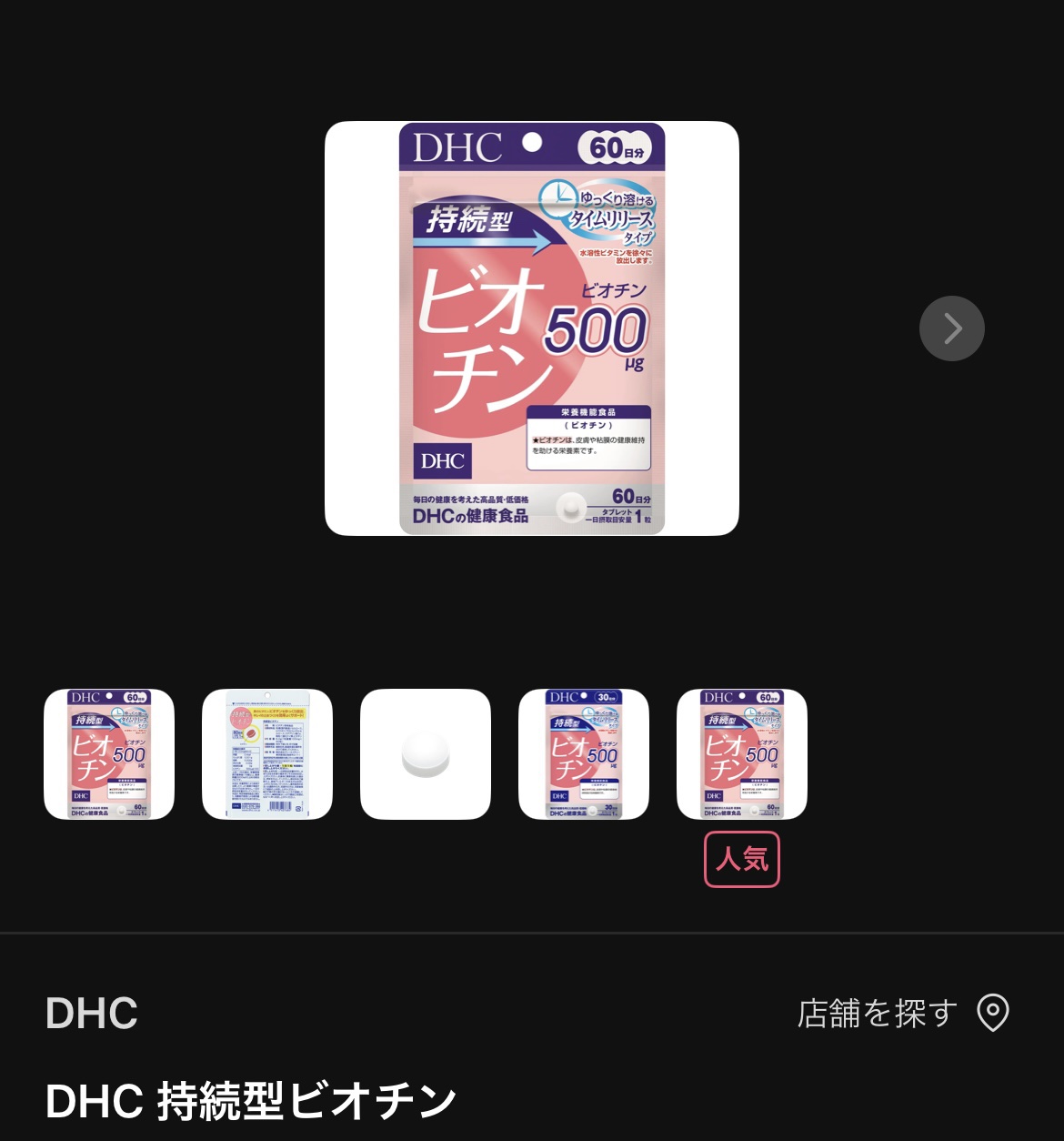 - 「持続型ビオチン」は、ゆっくり溶けるタイムリリース処方の栄養機能食品です。 皮膚や粘膜の健康に深くかかわる、美のビタミンとして知られているビオチンをじっくりと補え、キレイの土台づくりを効率よくサポートします。 栄養機能表示 ●ビオチンは、皮膚や粘膜の健康維持を助ける栄養素です。 ※水またはぬるま湯で噛まずにそのままお召し上がりください。 ※本品は、多量摂取により疾病が治癒したり、より健康が増進するものではありません。一日の摂取目安量を守ってください。 ※本品は、特定保健用食品と異なり、消費者庁長官による個別審査を受けたものではありません。 【名称】 ビオチン含有食品 【原材料名】 粉糖(国内製造)/セルロース、ヒドロキシプロピルメチルセルロース、ステアリン酸Ca、微粒二酸化ケイ素、ビオチン 【飲み方】 一日の摂取目安量1粒 【栄養成分表示[1粒100mgあたり]】 熱量0.4kcal、たんぱく質0.001g、脂質0.002g、炭水化物0.09g、食塩相当量0g、ビオチン500μg(1000) 上記()内の値は、栄養素等表示基準値(18歳以上、基準熱量2200kcal)に占める割合[%]です。 ※一日の目安量を守って、お召し上がりください。 ※お身体に異常を感じた場合は、摂取を中止してください。 ※特定原材料及びそれに準ずるアレルギー物質を対象範囲として表示しています。原材料をご確認の上、食物アレルギーのある方はお召し上がりにならないでください。 ※薬を服用中あるいは通院中の方、妊娠中の方は、お医者様にご相談の上お召し上がりください。 ●直射日光、高温多湿な場所をさけて保存してください。 ●お子様の手の届かないところで保管してください。 ●開封後はしっかり開封口を閉め、なるべく早くお召し上がりください。 食生活は、主食、主菜、副菜を基本に、食事のバランスを。