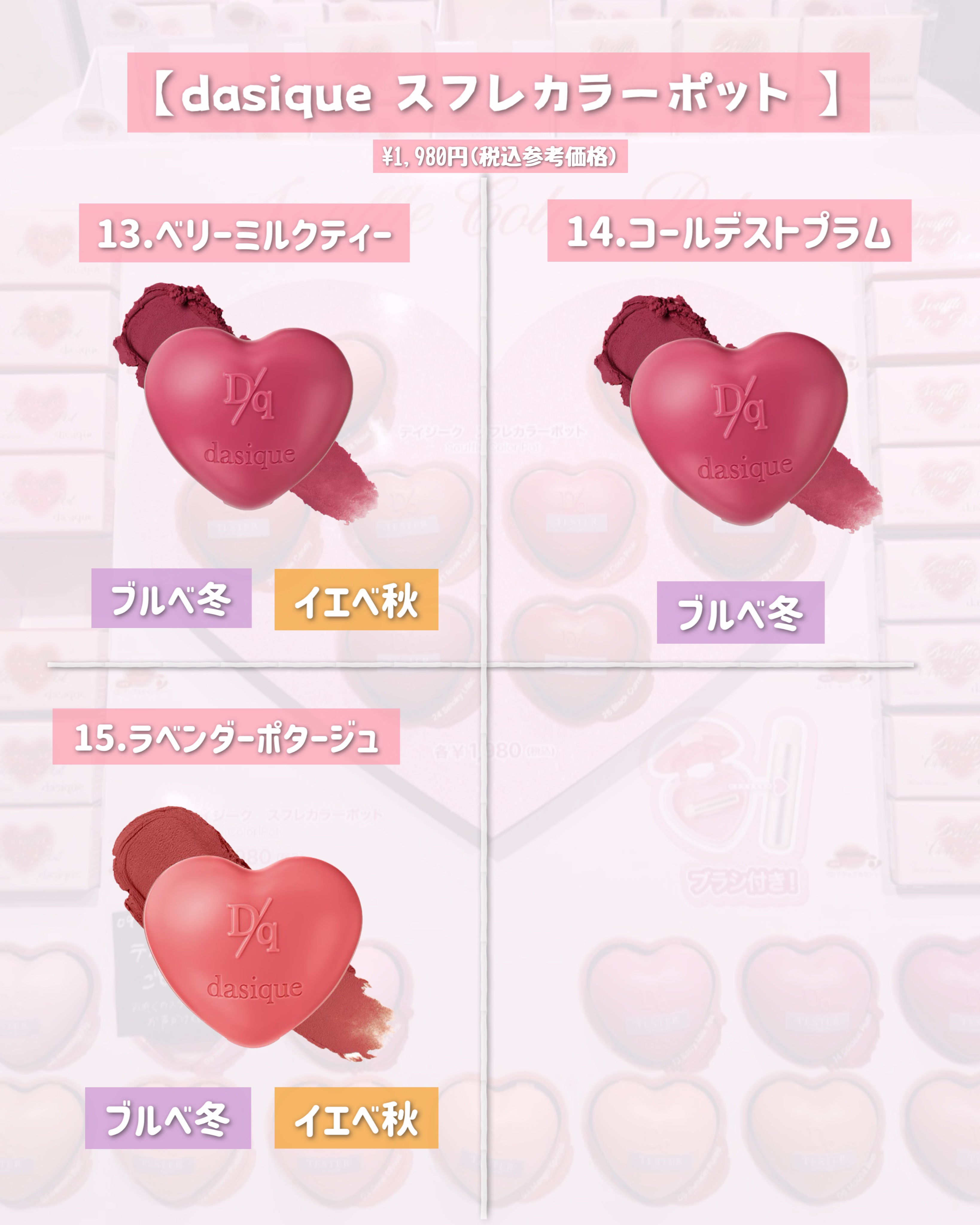 滑らかなテクスチャーで軽さのあるスフレが詰まった コロンとキュートなハート型ポット。 指でもブラシでもスポンジでも簡単にほわっとグラデーションが作れて 塗り広げるとサラッとした仕上がりでムラにもなりにくい🫶 単体でも仕込みチーク&リップとしても、違う色を重ねても◎