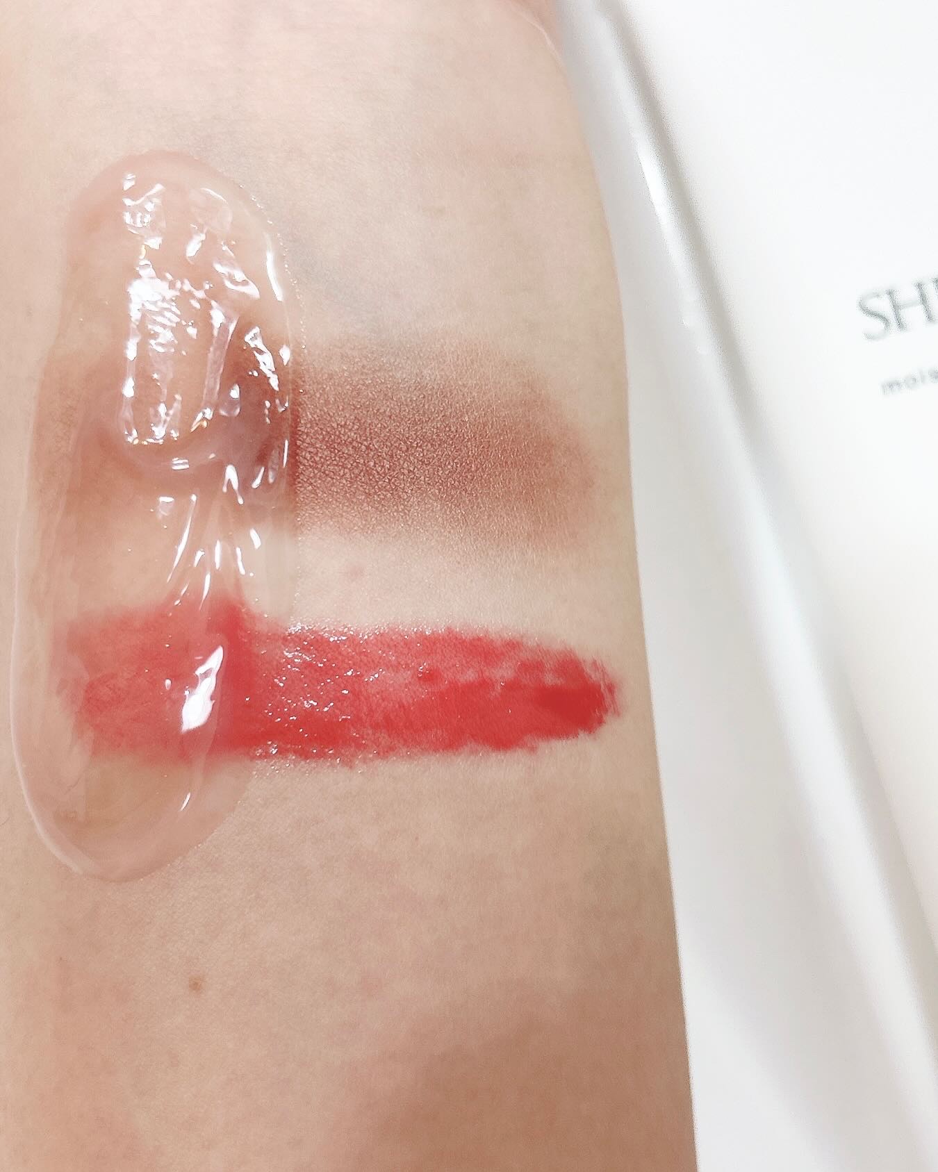 指で押さえてむにゅっと パールでキラキラ感はあるけど、細かいので本当に上品♡ 肌に乗せると見た目よりも明るいテラコッタオレンジに発色しました。 さらさらなのに伸びもよく、濃さも自由自在で、とても使いやすい&かわいい新作チークでした♡♡♡