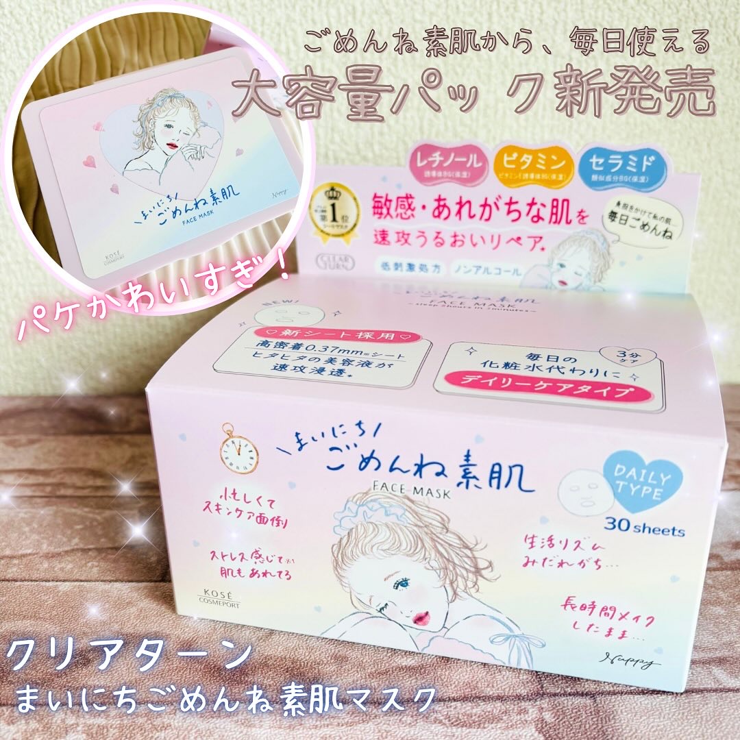 #PR#クリアターン★新発売★ごめんね素肌から毎日使える大容量パックが登場!まいにちごめんね素肌マスク30枚入り化粧水代わりの3分ケアで、負担をかけがちな肌を速攻リペア★あれがちな肌も使いやすい「低刺激設計」高密着!シンクロフィットベンリーゼ...