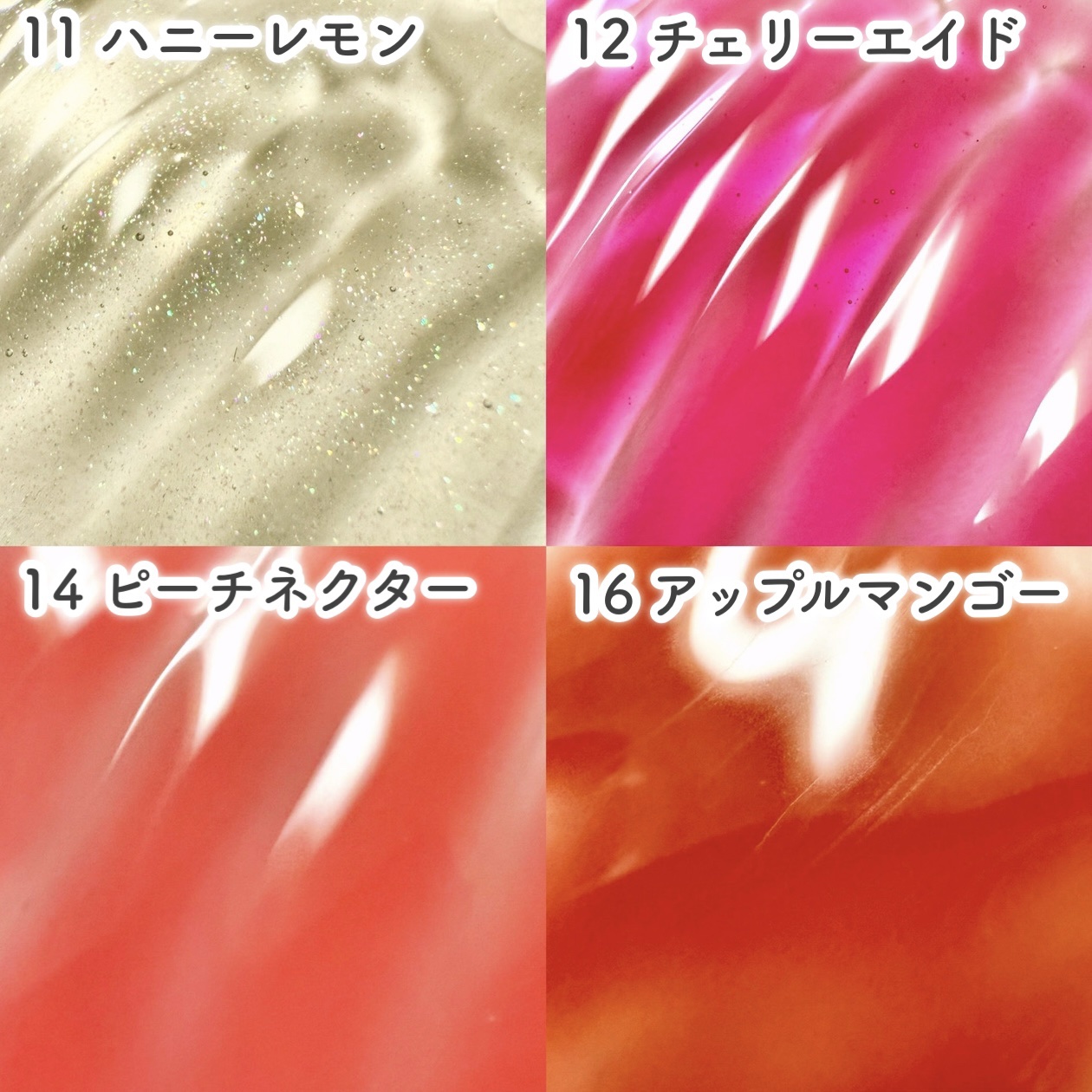 自然由来の高保湿オイルベースでなめらかでしっとりした唇に💋 プランピング効果もあります♡ 特に11 ハニーレモンは他のカラーと比べてプランピング効果が2倍とのこと! 私のお気に入りは16 アップルマンゴー🍎 落ち着いた色味てオシャレな雰囲気になれるので好きです♡