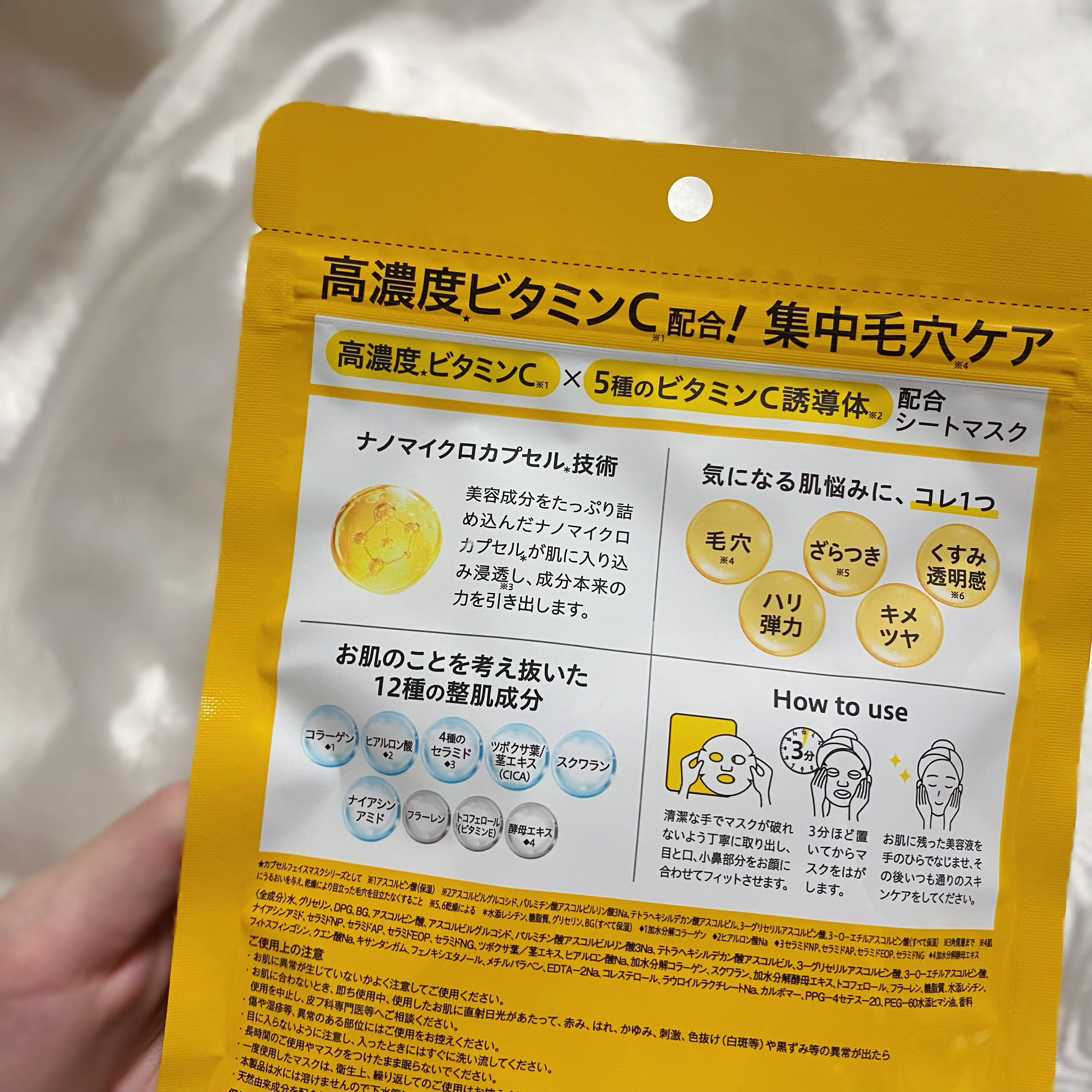 高濃度ビタミンCと5種類のビタミンC誘導体配合のシートマスクで集中毛穴ケア 🍋 薄手のシートでピタッと密着してくれるので、肌にぐんぐん届けてくれそうな使用感✨ 爽やかマンダリンオレンジの香り🍊 落ち着いた柑橘系の香りが好きな人には◎