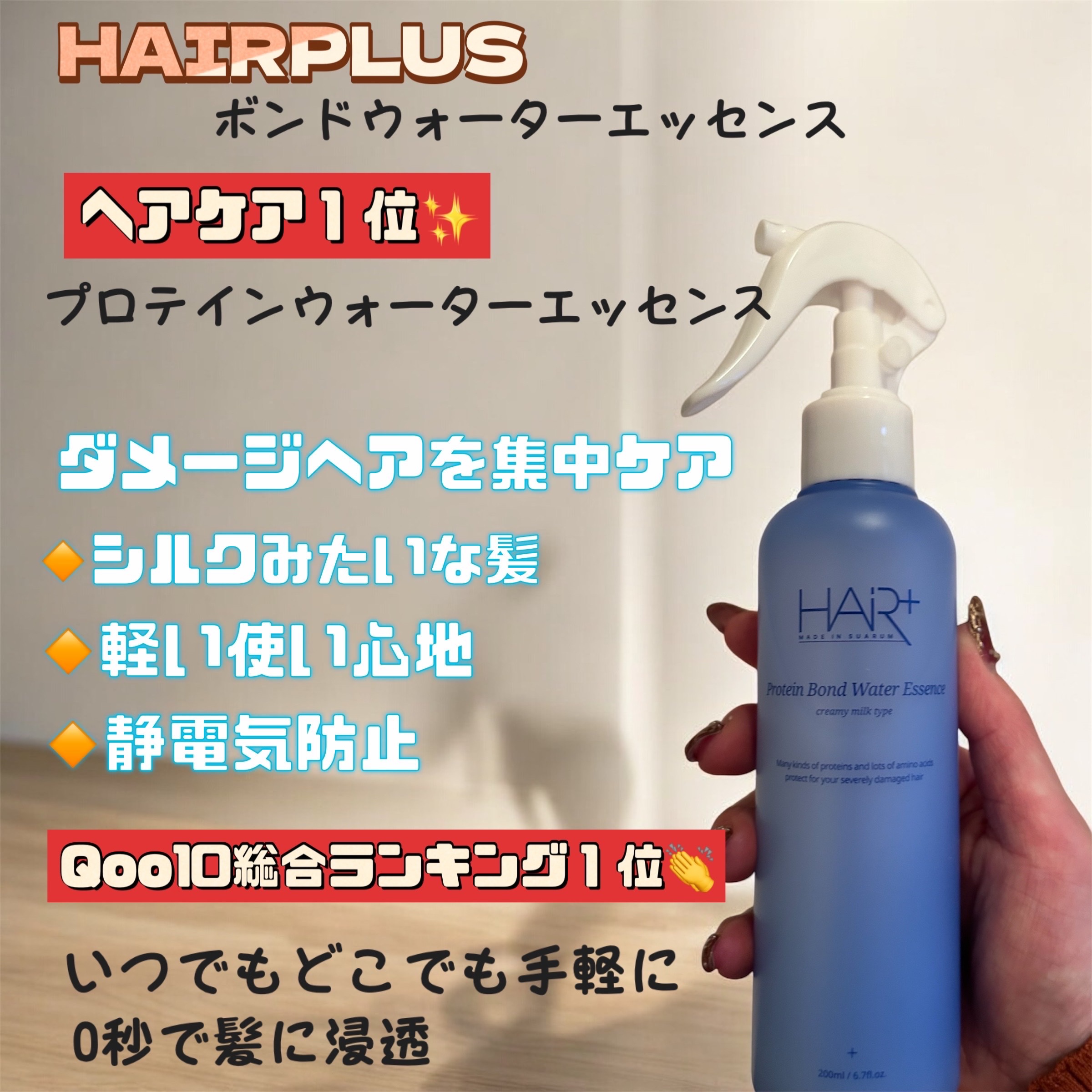 Qoo10総合ランキングでも1位 静電気防止・シルクのような髪へ・オイルは重い😭 タンパク質・天然由来保湿成分・ビタミン、果実酸 乳タンパク→ダメージヘアにタンパク質を補給 シトラスフローラルパウダーの香り 爽やかなんだけどパウダリー
