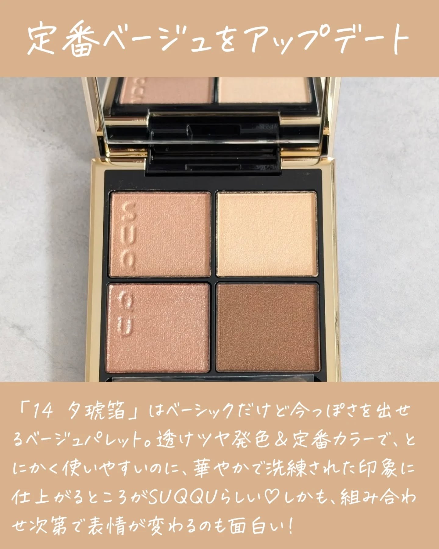 シグニチャーカラーアイズの新色「14 夕琥箔」を買ってきました~♡ こういうベージュパレットが欲しかった🥹!! カラーは定番。透け感やツヤ感、きらめきが今っぽくて可愛いんです。 なめらかなテクスチャーで密着感も良く、重ねても濁らないから、テクニックいらずでキレイに仕上がる。