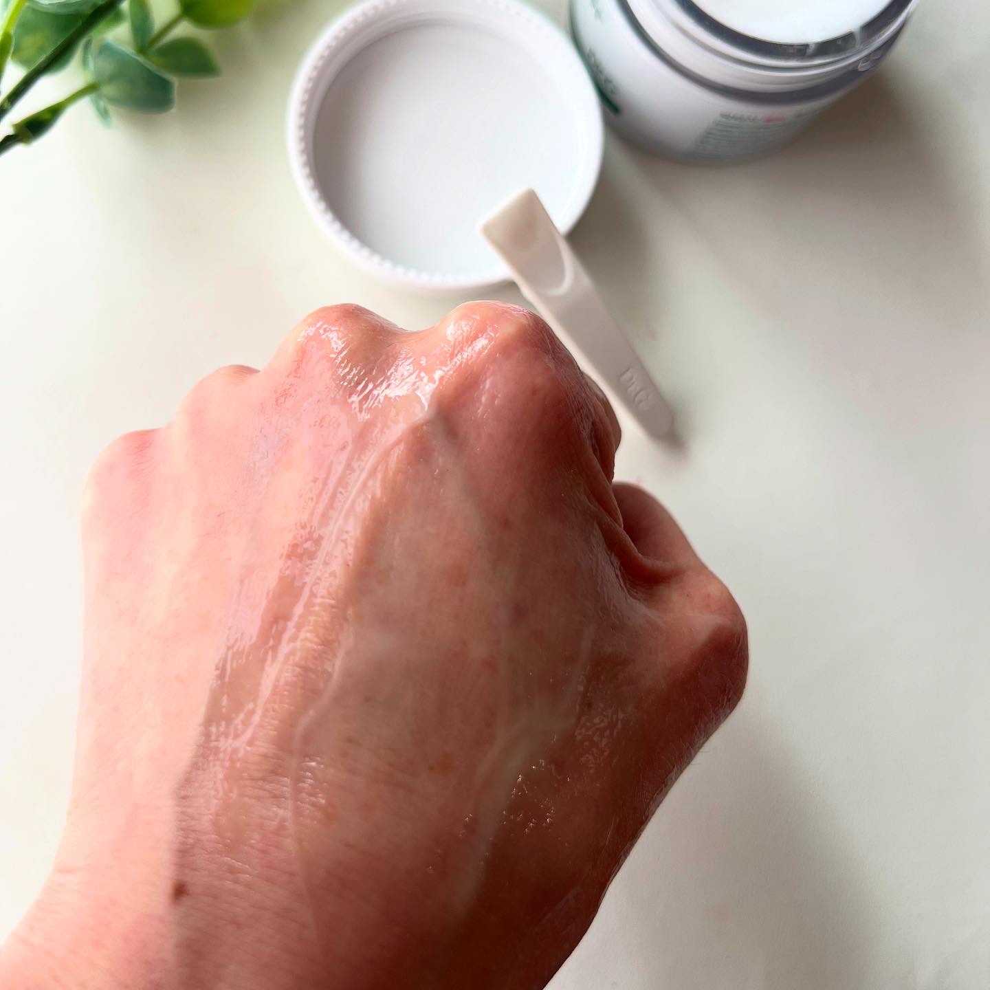 外部刺激による赤みや、メイクのりが気になる方に、クーリングケアするスージングクリーム♪ 外部から刺激を受けると、肌は敏感になりやすく赤みが出ちゃうことがあるんですって! こちらにはCICA成分が配合されているから肌トラブルの鎮静に効果的! クリームをすくうと、ぷるぷるとしたみずみずしいテクスチャー! 水分量がたっぷりで、肌に塗り広げやすく肌馴染みもいい感じです♡