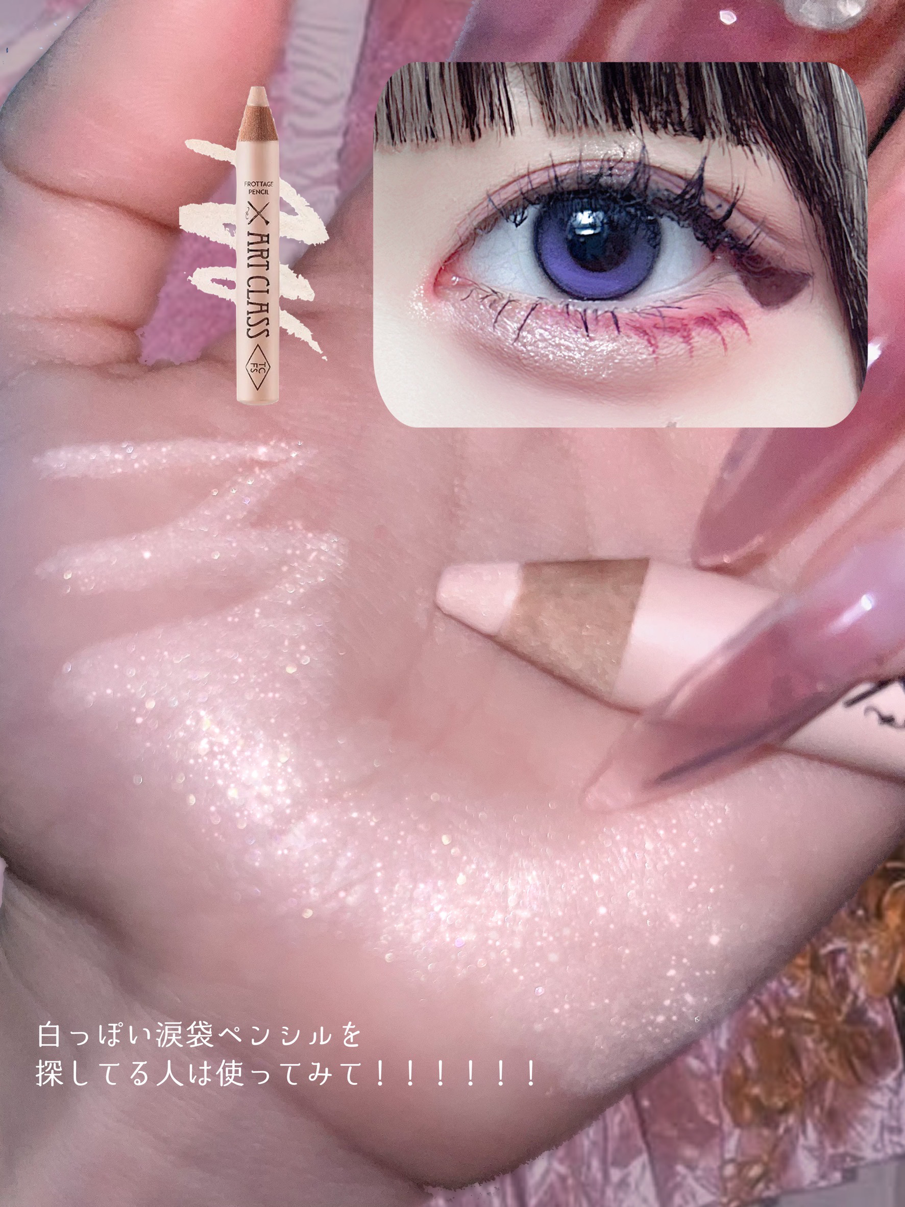 【涙袋爆誕!】バズってて気になってたtoocoolforschoolのフロッタージュペンシルを購入しました!色味は明るめのベージュを選択。キラキラが入ってるからコンシーラーとアイシャドウいらない!?2工程が1工程に減ったらめっちゃ嬉しい(泣)...