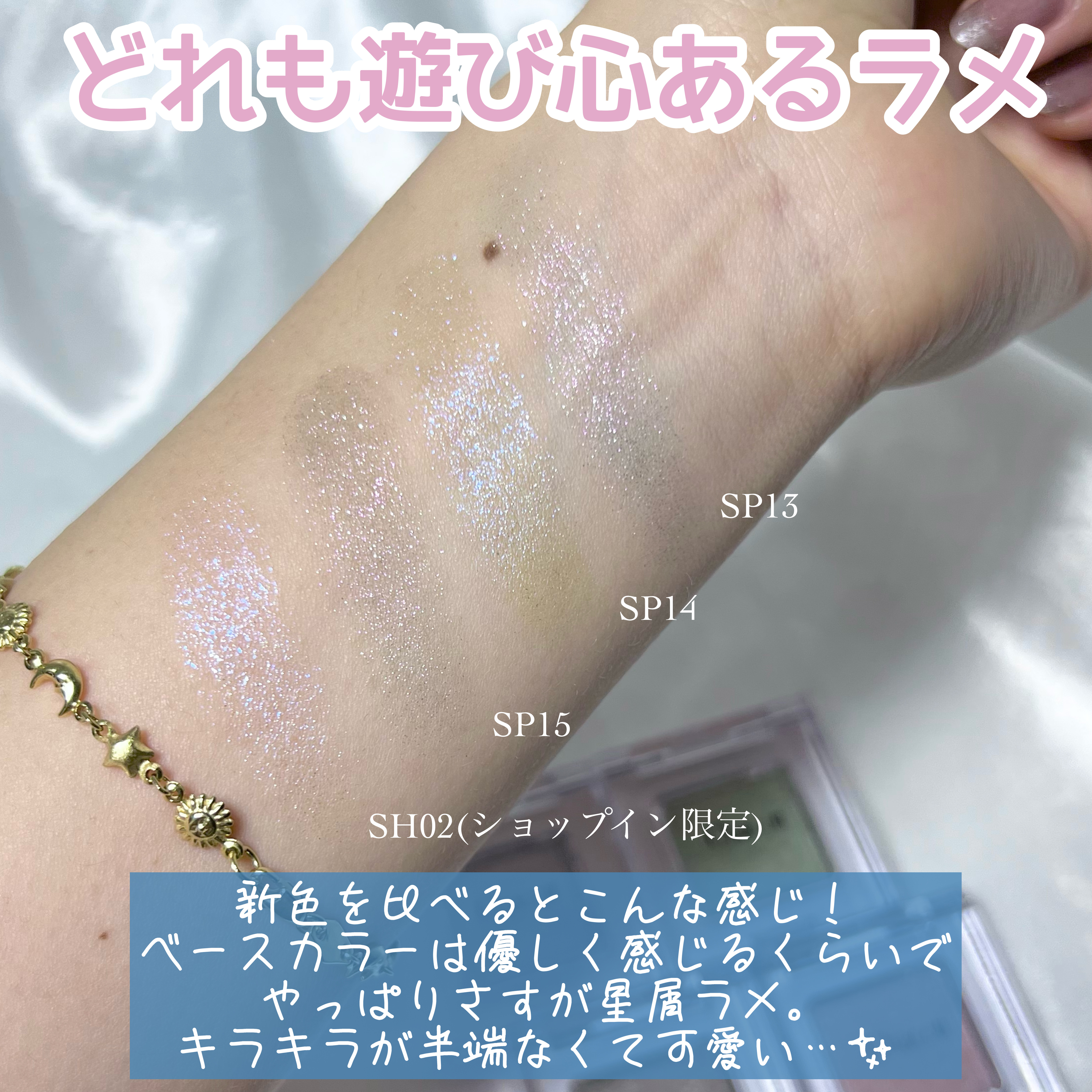 - 9つの質感に秘められた無限の可能性を持つカラーバリエーション。 【スパークル】大小のパールとラメが、光を集め解き放つスパークル。肌にフィットし、ゴージャスな煌めきを演出します。 単色使いはもちろんのこと、ハイライトやポイント使いなど、どこに輝きを追加するかは、あなた次第。 <SP06><SP07><SP08><SP09><SP10> キラキラなジェルクリームタイプ ラメが肌にしっかりフィットし煌めきと発色が長続きします。 おすすめの使い方:アイシャドウ、ハイライト <SP11> 輝度の高いラメをふんだんに使用したクリアに煌めくホワイトラメ <SP12> 輝きだけではなく目元の透明感まで引き出してくれるパープルラメ