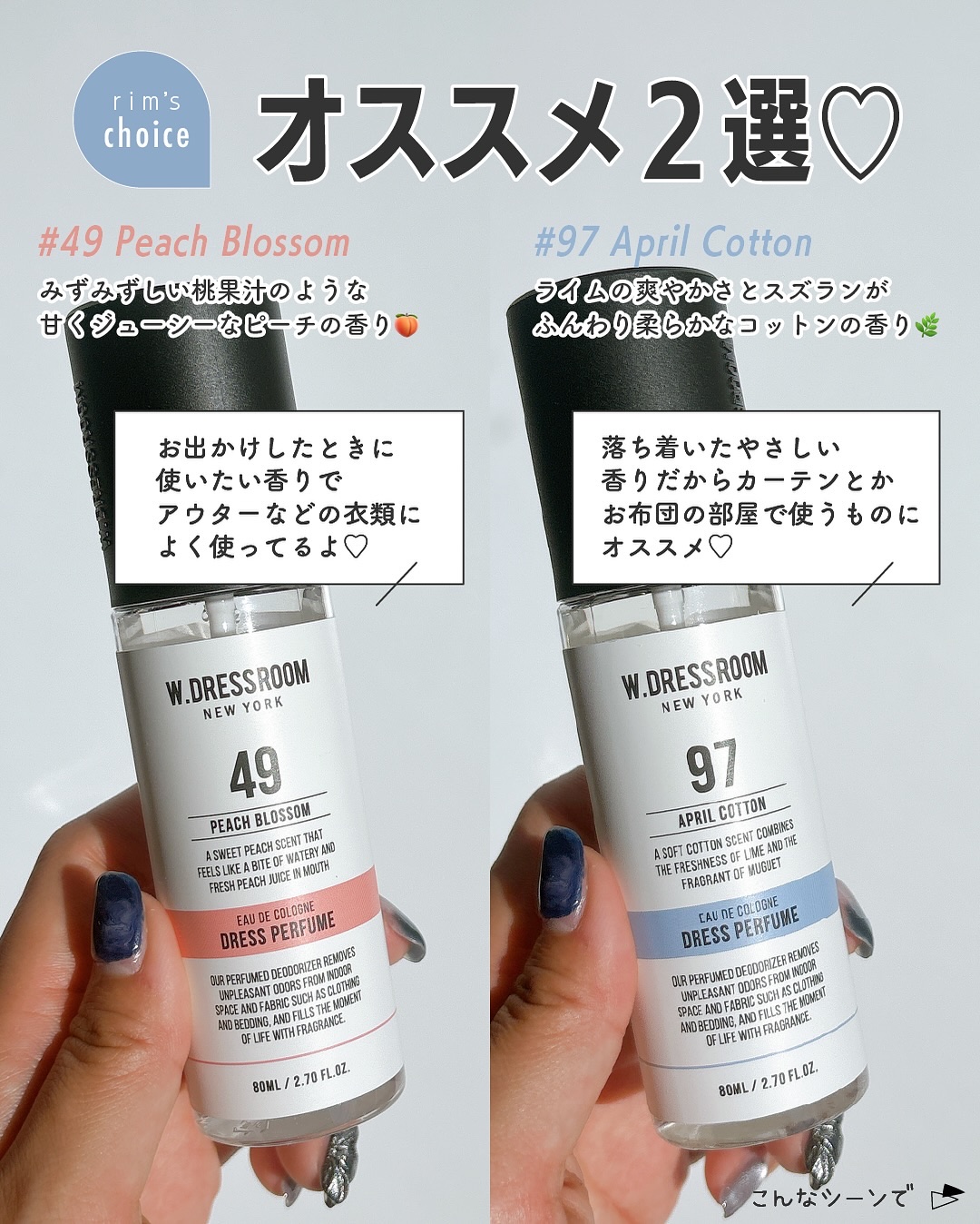 嫌な匂いが残ったまま香りを重ねるのではなく、脱臭効果が99%!! 24時間香りが持続するの。 ピーチブロッサムはみずみずしい桃の甘さがふわっと広がるやさしい女の子っぽい香り❤︎ エイプリルコットンはライムの爽やかさとスズランがふんわりやさしく香るコットンの香り❤︎