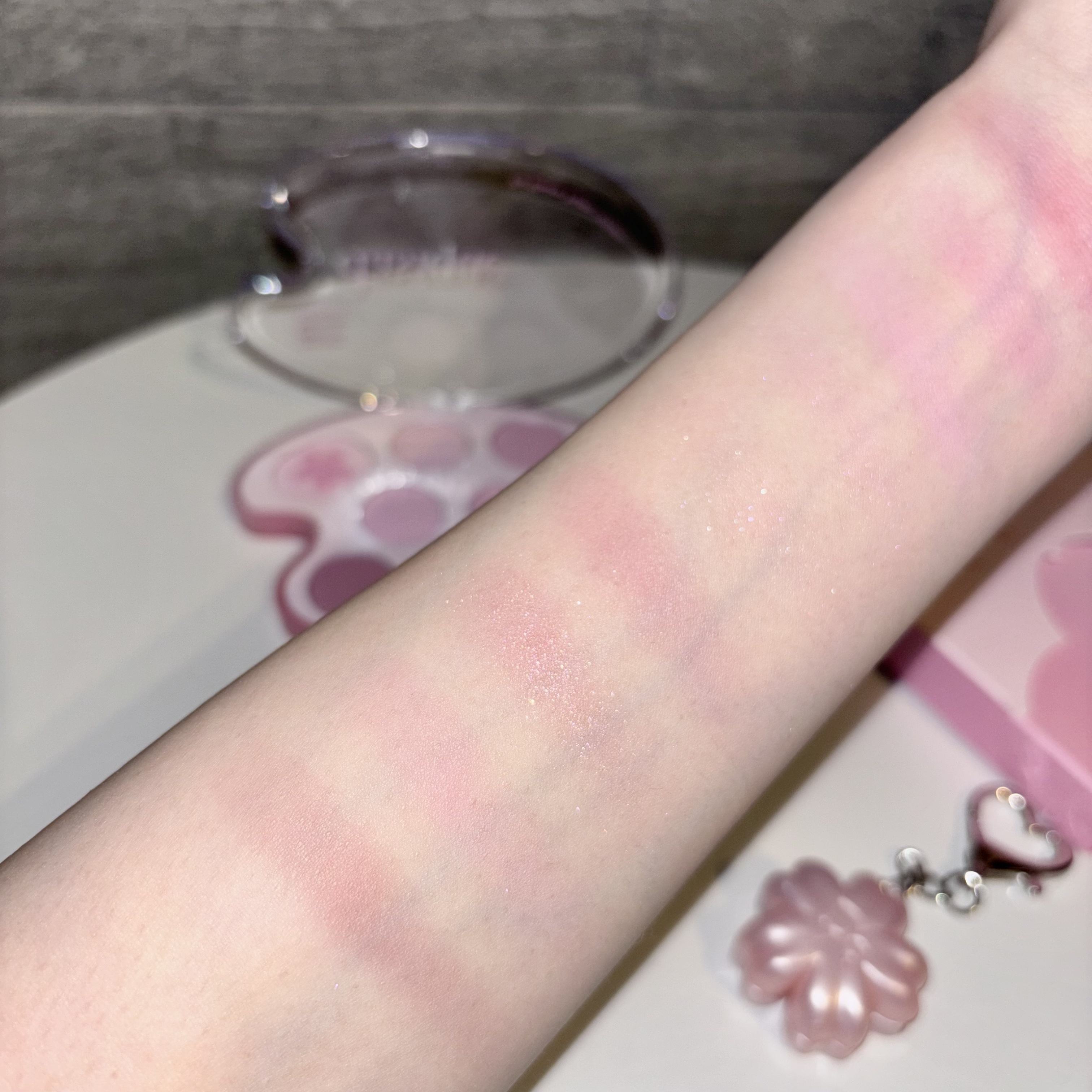 アイシャドウは可愛い配色なのはもちろんのこと、予想していたより発色が良くて驚きました!❤︎ 私は白みピンクが大好物であり得意なのでまぶたでも綺麗に発色してくれてドンピシャなカラー🥹🥹 ラメもそれぞれ個性があって素敵...😭🩷🩷 チークもまた予想以上に発色が良くて、驚きました😳 4色でグラデーションがしやすいし、ちゃんと見た目通りの発色なのでギャップを感じにくくて感動です... 可愛さだけじゃないところがさすがdasique🎀 おまけに付いていたグロスなどもめちゃくちゃ可愛くて、全部見ているだけで幸せになれそうです🥺
