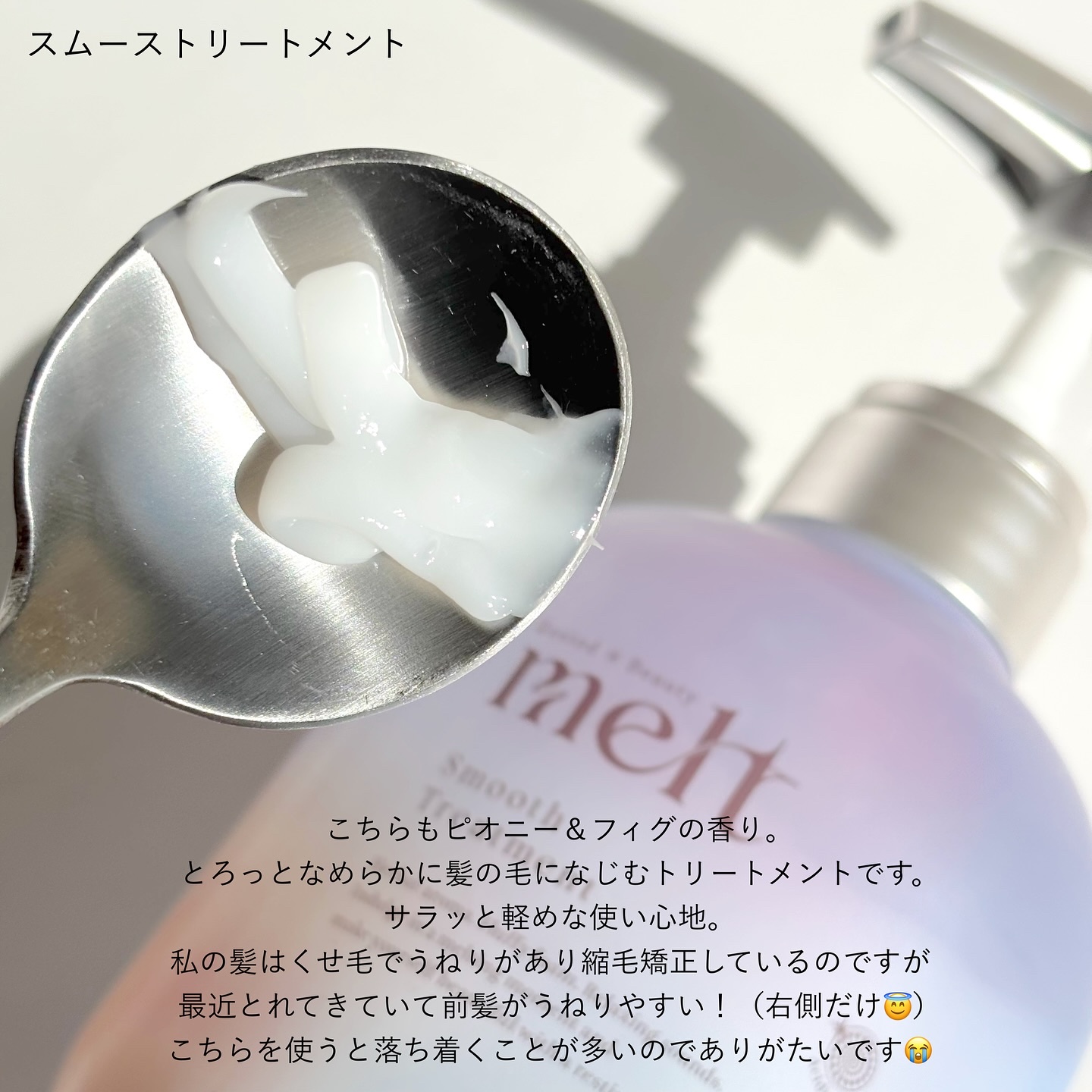 花王さまからいただきました✨3月15日に発売されるmeltのスムースシリーズ🩷meltスムースシャンプー🩷meltスムーストリートメントうねりケアのシリーズです✨どちらもピオニー&フィグの香り私のパサパサうねうねの髪のうねりが抑えられまとまっ...