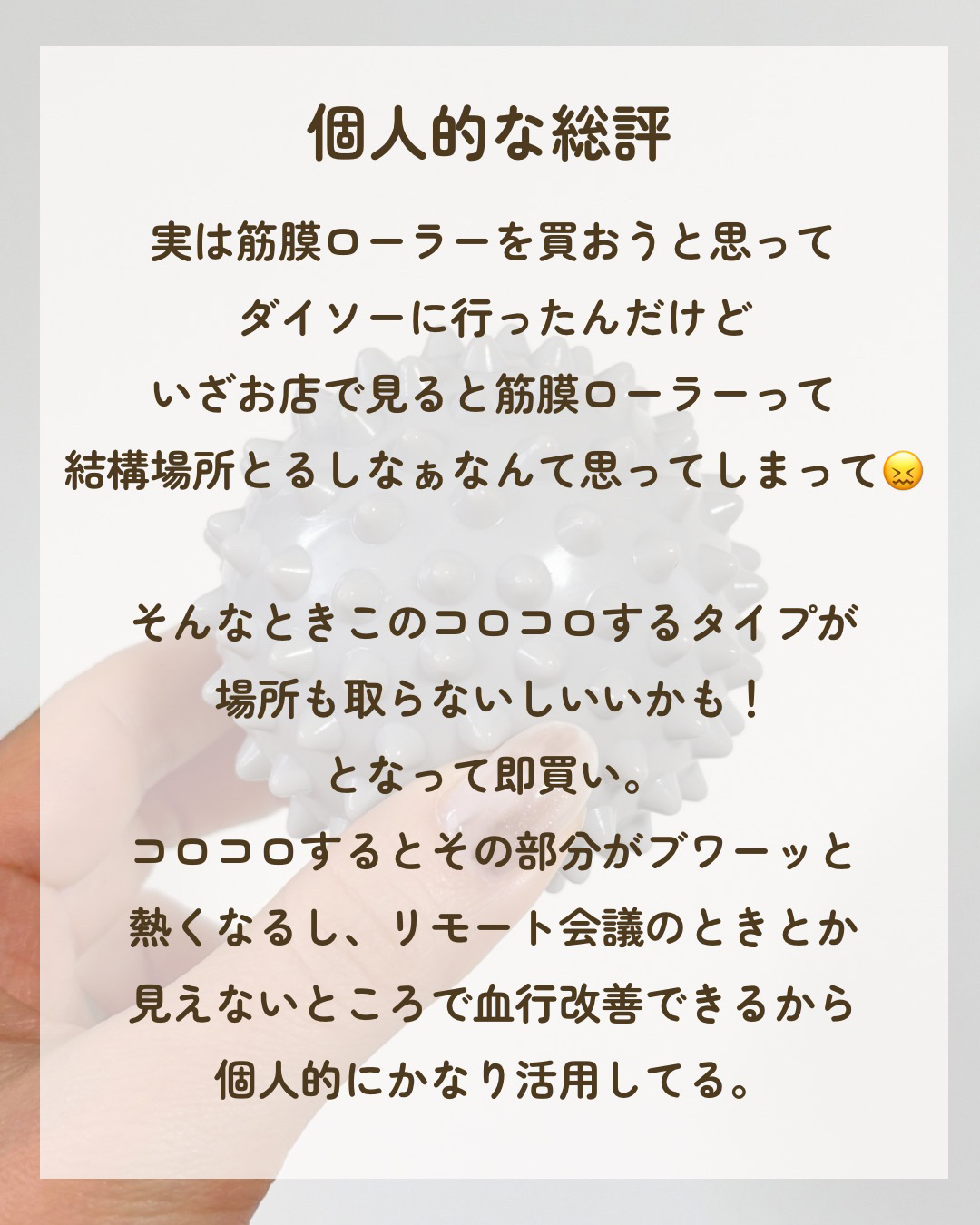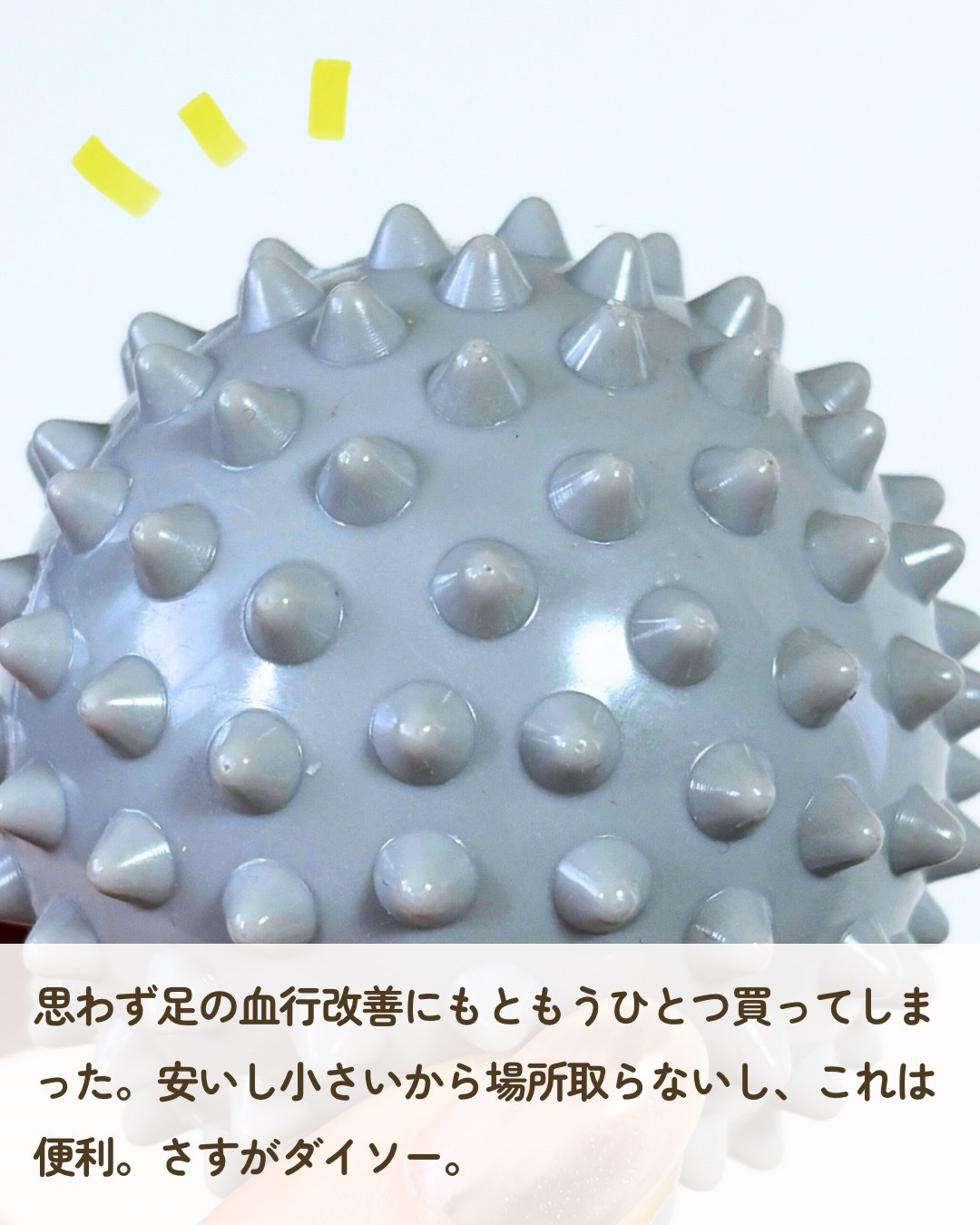 DAISOリフレッシュボール イボイボ●イボイボ突起がついたリフレッシュボール●手の平で握ったり、足の裏で転がすようにしながら踏むと気持ちいいです。ほぐれます。●100円なのに意外と壊れず使い続けられているので、試しに買って損はないと思います...