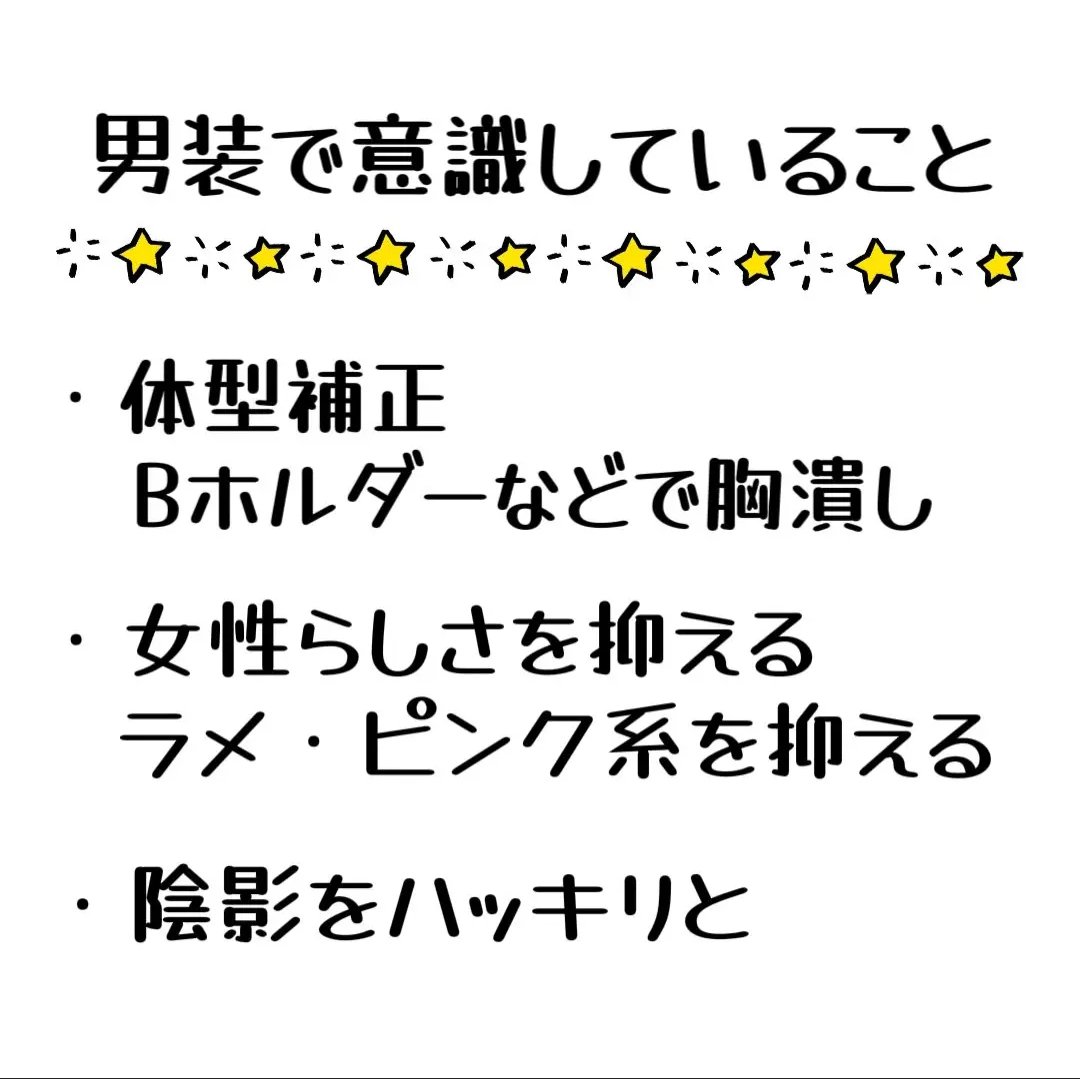 キャラの写真やイラストを見ながらメイクをする細かな所を分かるのでとってもやりやすいですよ 男装なので唇を薄くするためにファンデを塗ると〇 コンシーラーで事前に陰影をつくると、その後のメイクがやりやすくなります 男装をする際は基本的にラメやピンク系を控えるようにし、オレンジ系やブラウン系のものを使用してます