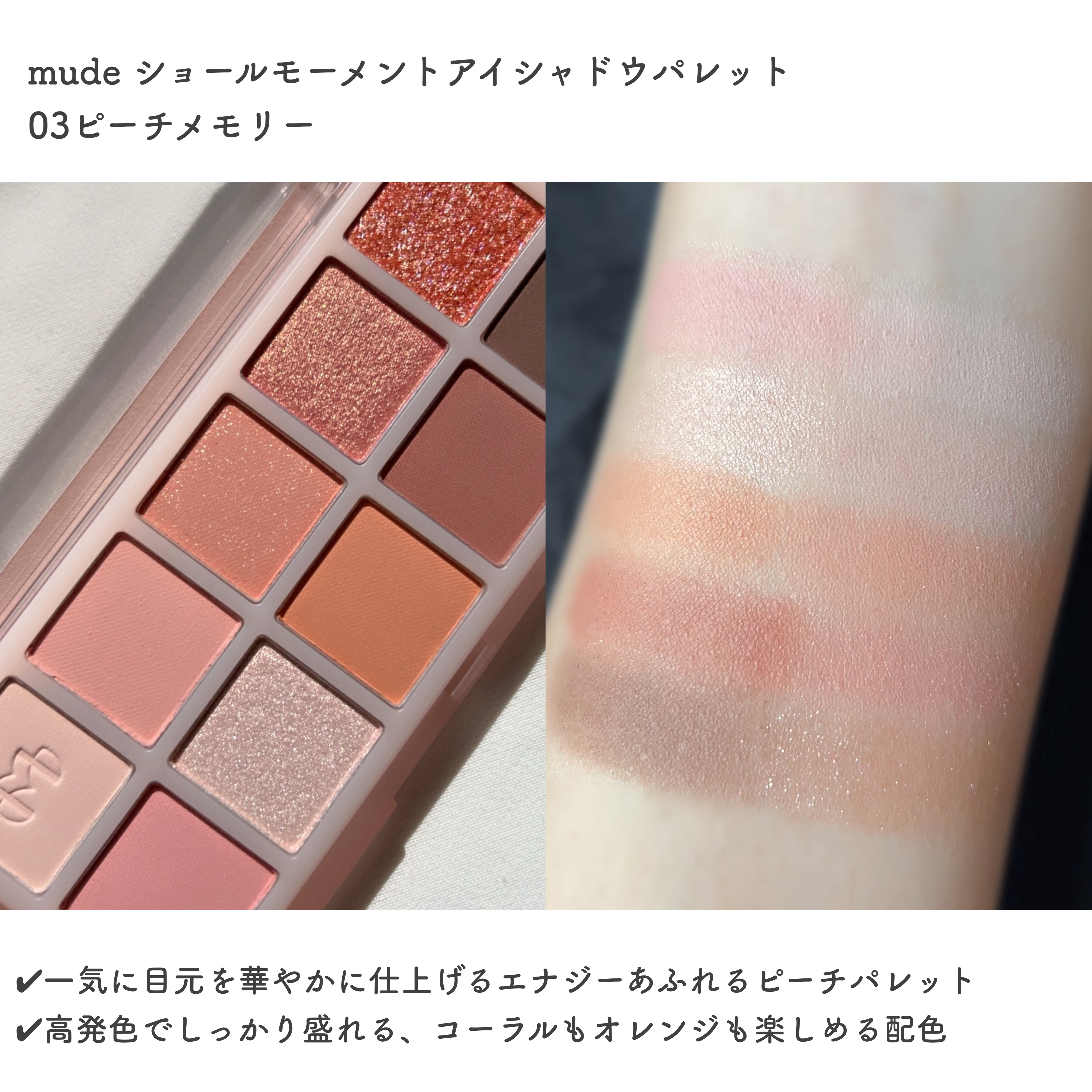 彩度高めのピーチオレンジパレット🍑🍊 もうこれは人生コスメ。絶対に盛りたい日はこれ。春ビビさんには絶対使ってみてほしい🥹 こちらも彩度高めのピーチ&アップルパレット🍑🍎 mudeよりはちょっと淡めで韓国ぽい可愛さになる💗 もはやイエベ春といえばこれと言っても過言ではないコーラルパレット🌸 これ一つでピンク系コーラル系ブラウン系全部楽しめる最強パレット💪