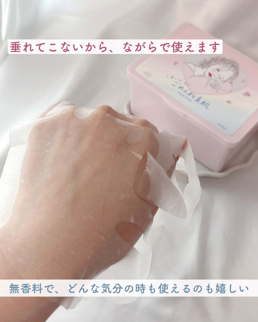- 毎日の化粧水代わりに 敏感・あれがちな肌を速攻うるおいリペア*できる 『まいにちごめんね素肌マスク』 ①化粧水代わりのクイックケアで、負担をかけがちな肌を速攻うるおいリペア* たった3分のクイックケアで美容液がたっぷり浸透*1✨ 外的ストレスや*2不規則な生活の影響を受けやすい肌も健やかな肌へ♪ ②あれがちな肌にもやさしい使い心地。低刺激設計 弱酸性・無香料・無着色・無鉱物油・アルコールフリー・パラベンフリー・紫外線吸収剤フリー・シリコーンフリーの低刺激処方。やさしい使い心地です。 *お手入れのこと *1角層まで *2乾燥による刺激のこと