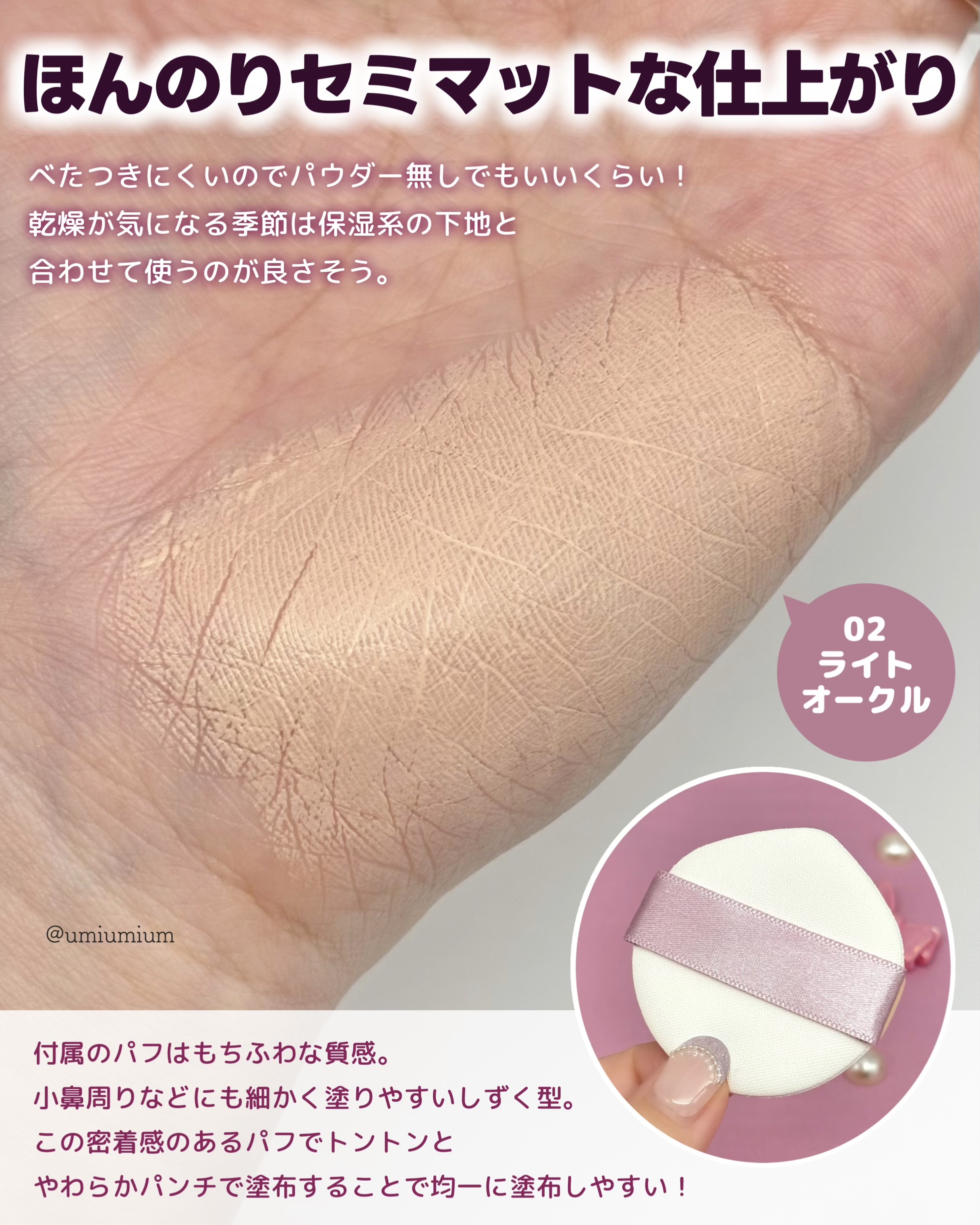 - <01 ピンクベージュ> 水、シクロペンタシロキサン、トリエチルヘキサノイン、ジフェニルシロキシフェニルトリメチコン、PEG-9ポリジメチルシロキシエチルジメチコン、BG、ジメチコン、PEG-10ジメチコン、(ビニルジメチコン/メチコンシルセスキオキサン)クロスポリマー、ジグリセリン、トリメチルシロキシケイ酸、ペンチレングリコール、ナイアシンアミド、加水分解バオバブエキス、水添レシチン、セラミドNG、フィトステロールズ、塩化Na、(ジメチコン/ビニルジメチコン)クロスポリマー、水酸化Al、ジステアルジモニウムヘクトライト、フェノキシエタノール、含水シリカ、トリエトキシカプリリルシラン、ハイドロゲンジメチコン、ステアリン酸、トコフェロール、カプリリルグリコール、キサンタンガム、酸化チタン、タルク、酸化鉄 <02 ライトオークル> 水、シクロペンタシロキサン、トリエチルヘキサノイン、ジフェニルシロキシフェニルトリメチコン、PEG-9ポリジメチルシロキシエチルジメチコン、BG、ジメチコン、PEG-10ジメチコン、(ビニルジメチコン/メチコンシルセスキオキサン)クロスポリマー、ジグリセリン、トリメチルシロキシケイ酸、ペンチレングリコール、ナイアシンアミド、加水分解バオバブエキス、水添レシチン、セラミドNG、フィトステロールズ、塩化Na、(ジメチコン/ビニルジメチコン)クロスポリマー、水酸化Al、ジステアルジモニウムヘクトライト、フェノキシエタノール、含水シリカ、トリエトキシカプリリルシラン、ハイドロゲンジメチコン、ステアリン酸、トコフェロール、カプリリルグリコール、キサンタンガム、酸化チタン、タルク、酸化鉄 <03 オークル> 水、シクロペンタシロキサン、トリエチルヘキサノイン、ジフェニルシロキシフェニルトリメチコン、PEG-9ポリジメチルシロキシエチルジメチコン、BG、ジメチコン、PEG-10ジメチコン、(ビニルジメチコン/メチコンシルセスキオキサン)クロスポリマー、ジグリセリン、トリメチルシロキシケイ酸、ペンチレングリコール、ナイアシンアミド、加水分解バオバブエキス、水添レシチン、セラミドNG、フィトステロールズ、塩化Na、(ジメチコン/ビニルジメチコン)クロスポリマー、水酸化Al、ジステアルジモニウムヘクトライト、フェノキシエタノール、含水シリカ、トリエトキシカプリリルシラン、ハイドロゲンジメチコン、ステアリン酸、トコフェロール、カプリリルグリコール、キサンタンガム、酸化チタン、タルク、酸化鉄