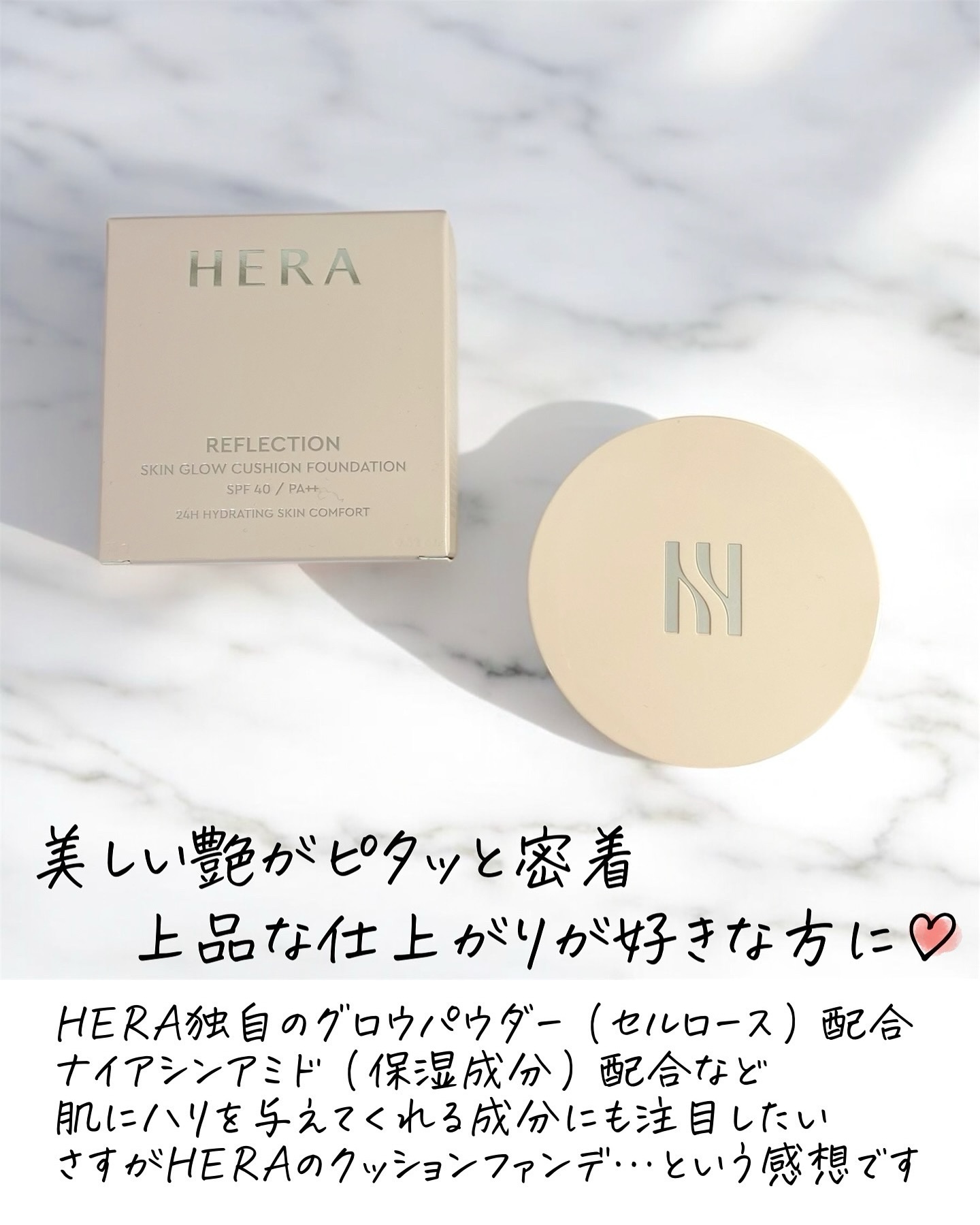 - ■光を味方につけ、しなやかに艶めくリフレクショングロウ クッションファンデーションでは初*1のコーティング技術・グロウリフレクサーTMを採用。 明るい陽の光が差し込むように、どの角度から見ても美しく艶めく立体感を叶えます。 HERA独自のグロウパウダー*2を配合し、透き通るようにエレガントで繊細なグロウ感を纏った上品な素肌感を演出。 時間が経っても、つけたての美しい艶肌が一日中つづきます。 ■美しい艶めきをキープする“ハイブリッドメッシュTM” スポンジ+メッシュのダブルフィルター構造の“ハイブリッドメッシュTM”を採用した新感覚クッション。 ダブル構造でみずみずしいファンデーションを薄く均一に肌にのせられるよう設計。 軽やかなテクスチャーがより繊細に、溶け込むように肌になじみ、美しい艶めきとメイクしたての仕上がりを長時間キープします。 ■24時間*3うるおいがつづくスキンケアフォーミュラ ペプチドを含む3種のカメリアコンプレックス*4配合で、キメがうるおいで満たされたようなしっとりとした付け心地。 さらに、ナイアシンアミド*5とビタミンC*6配合で肌にハリを与え、内側から艶めきがあふれるような透明感*7のある肌に導きます。 *1 アモーレパシフィック社において *2 セルロース *3 当社調べ、効果に個人差があります *4 ツバキ種子油、ツバキ種子エキス、ツバキ花エキス(保湿成分) *5 保湿成分 *6 アスコルビン酸(保湿成分) *7 うるおいによる