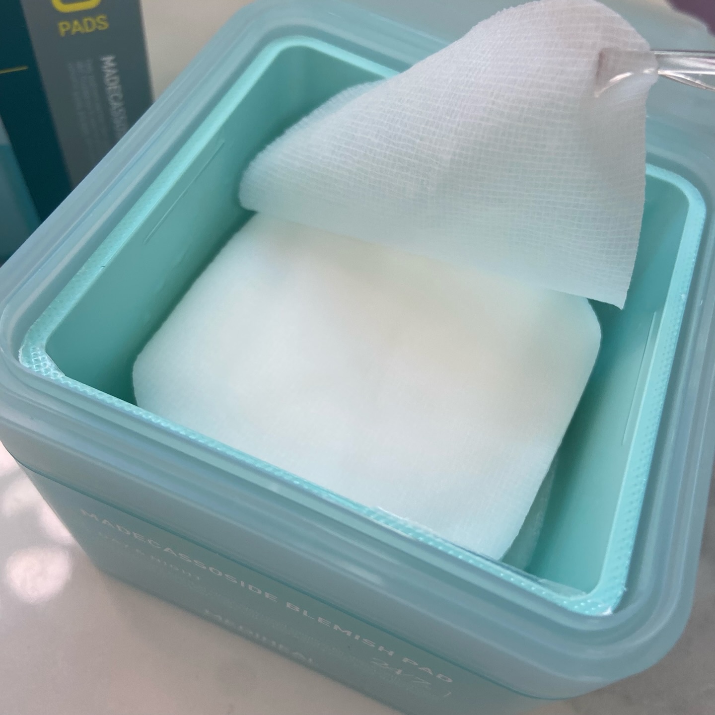 ガーゼ素材の肌荒れ防止ケアパッド🤍 さっぱりアフターケア、マデカソサイド*ツボクサエキスを2回抽出し、マデカソサイド配合量2倍UP⤴️ リポソーム化で肌の奥まで素早く浸透* マデカソサイドの微粒子が浸透し、肌荒れを防止🌿 67mmのスクエアガーゼパッド ビッグサイズ&角の丸みでぴったり密着💕