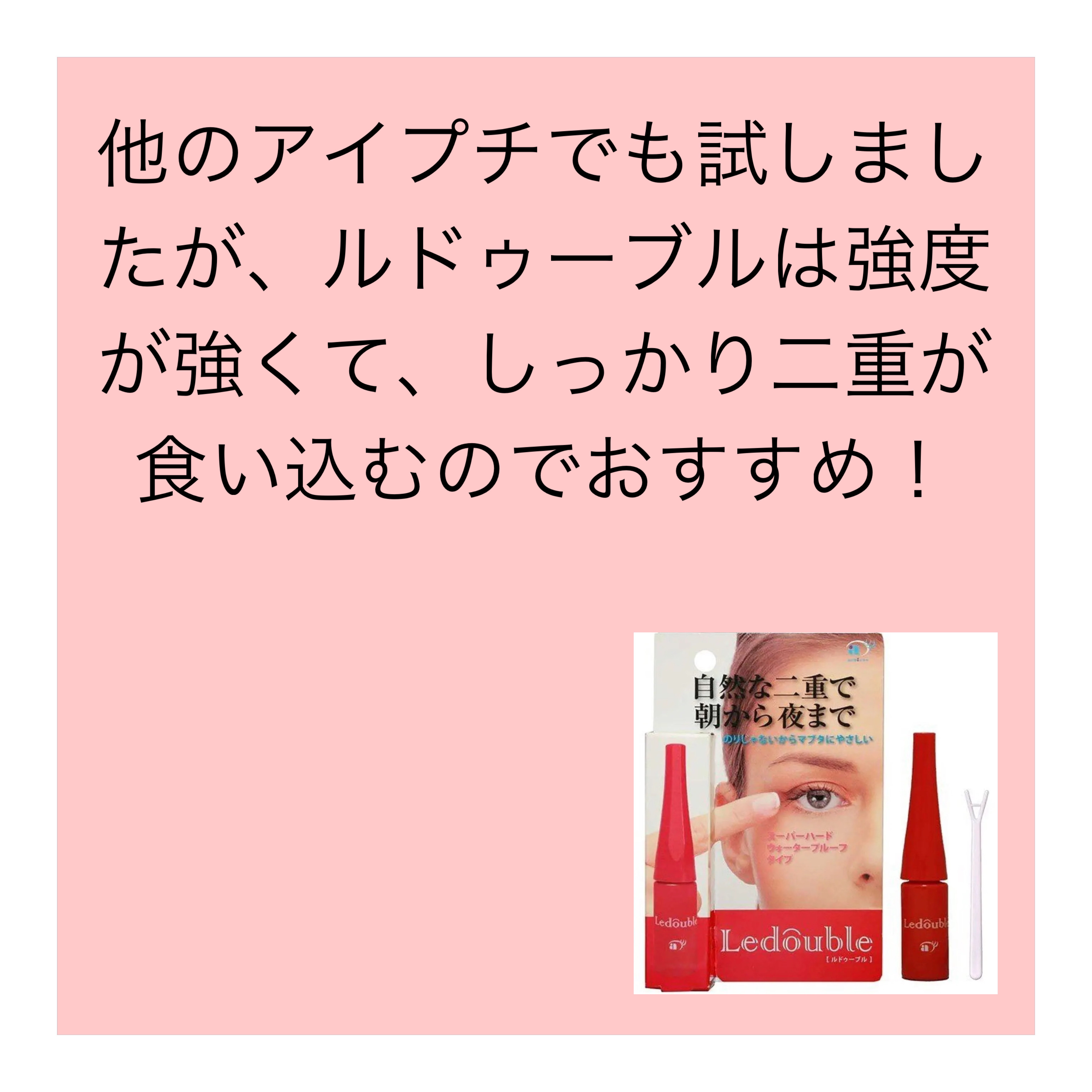 元々一重瞼でしたが、昼間は接着式アイプチで癖付け、夜はアイテープを付けて癖付けをしたことで、今は昼間は皮膜式アイプチで二重をキープ出来ています✨️ アイプチを塗っているところはまつ毛の際と二重の線の真下なので、使う量も比較的少なく、見た目もほとんど気になりません🤗 ルドゥーブルが深くくい込むのでルドゥーブルがオススメです!