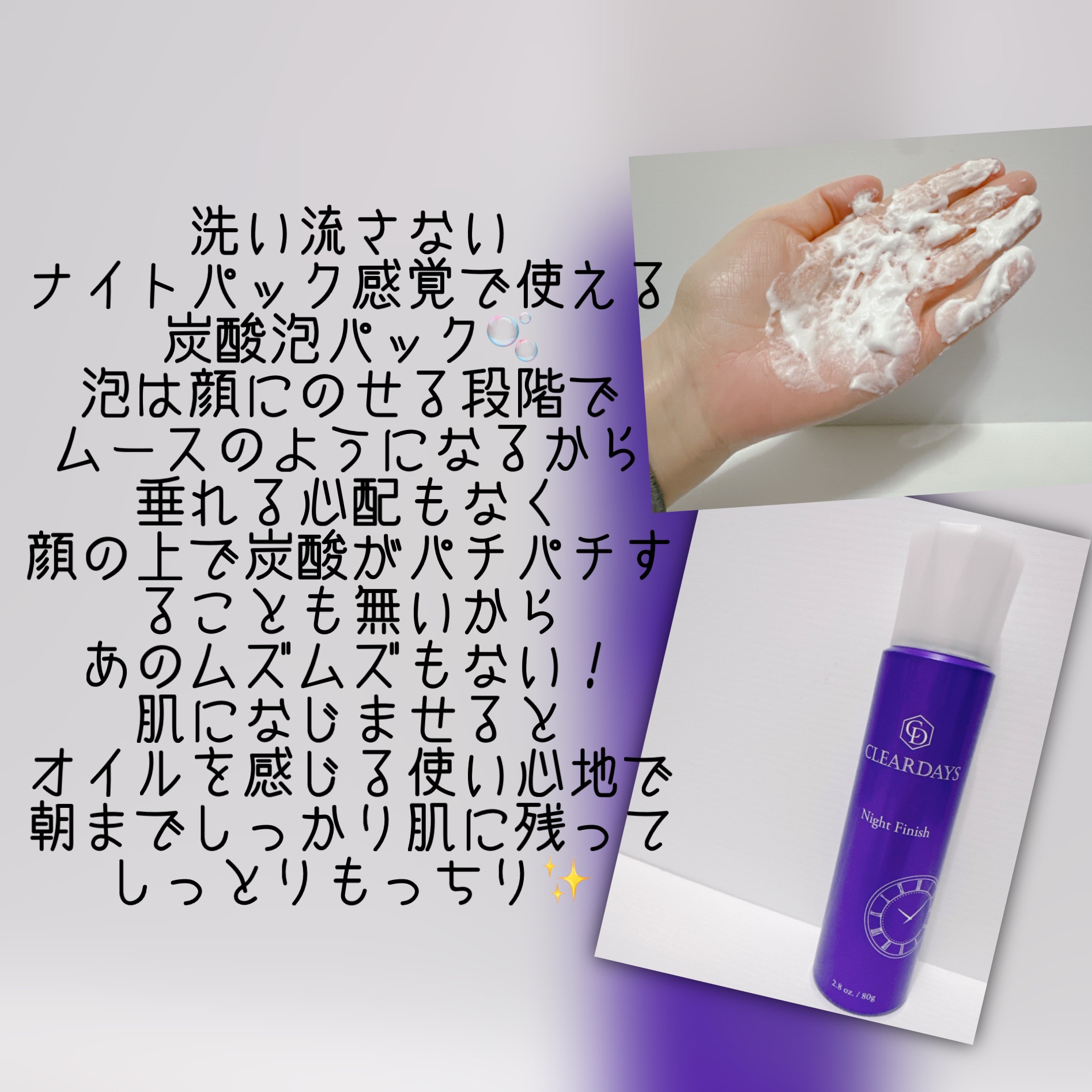 クリアデイズ ナイトフィニッシュを使ってみました。あふれるような輝きが湧き立つ、洗い流さないタイプのスリーピング炭酸泡パック。しっかりめのモコモコな泡です。ハーブのいい香りに癒されます。思ったより弾力性がある濃厚な泡の塊でした。肌にのせると溶...