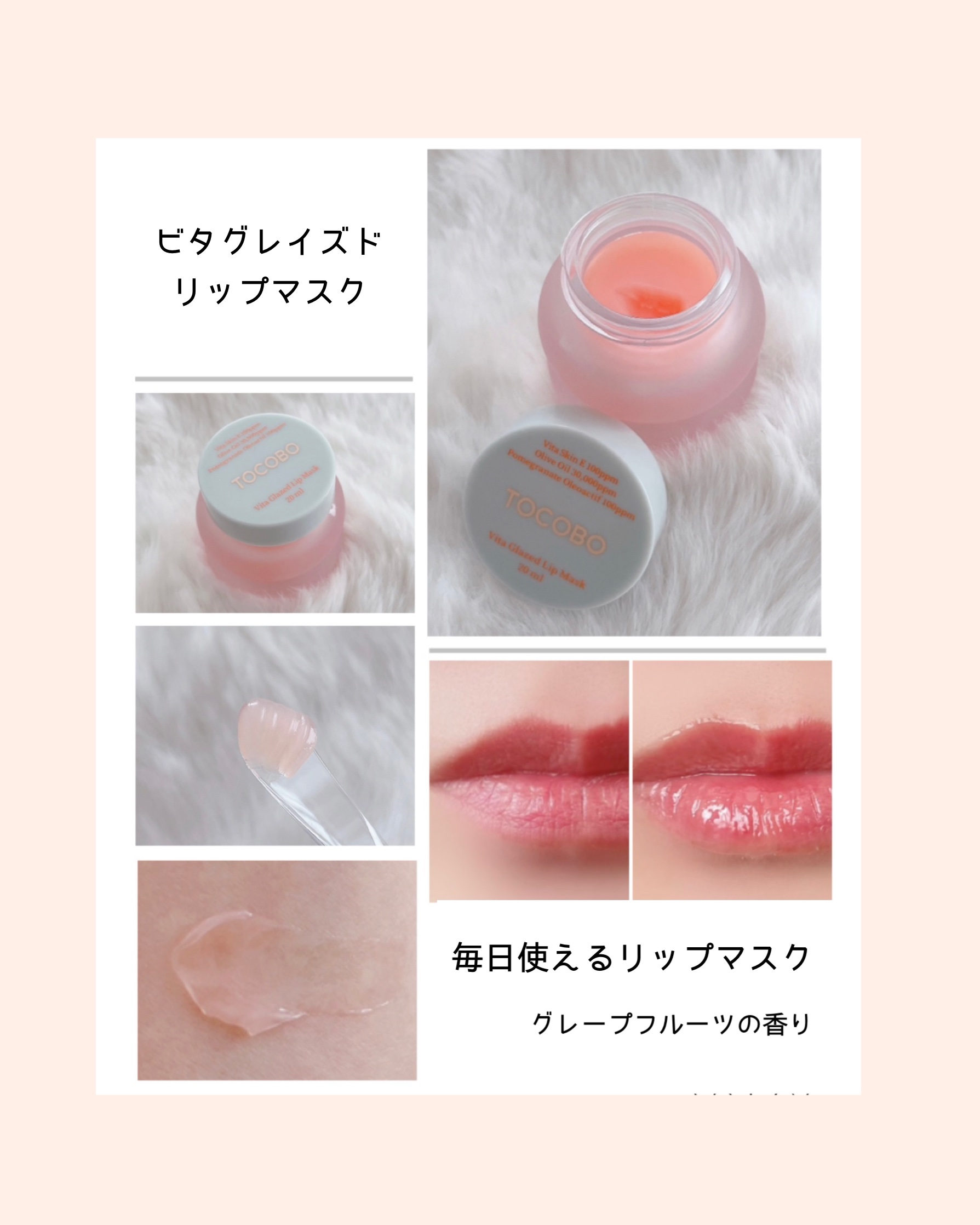 トコボ(tocobo)オーバーナイトリップマスク使用後、リップオイルでメイクを仕上げたら、角質のないふっくら輝くボリュームツヤリップメイク完成👏✨1、夜の間、唇の角質を落ち着かせるオーバーナイトリップマスク🩷️デイリーで使える「ビタグレイズド...