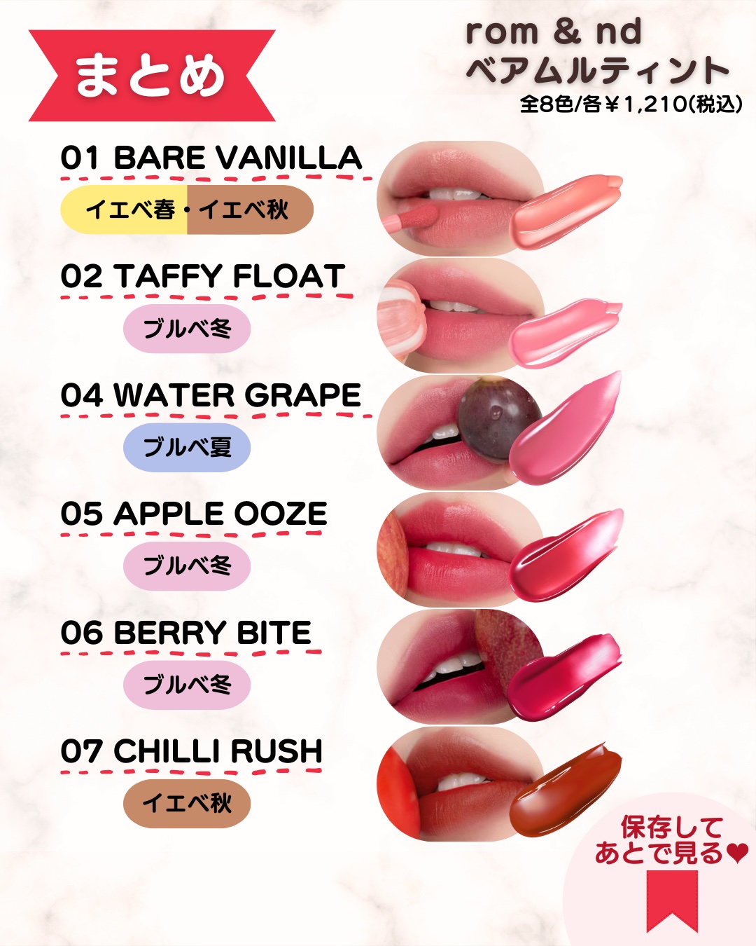 大人気ロムアンドリップをパーソナルカラー分類🎨保存推奨です🎀 rom&ndロムアンド ベアウォーターティント ¥1,540 パーソナルカラーは個人の判断です ご参考までに🎨