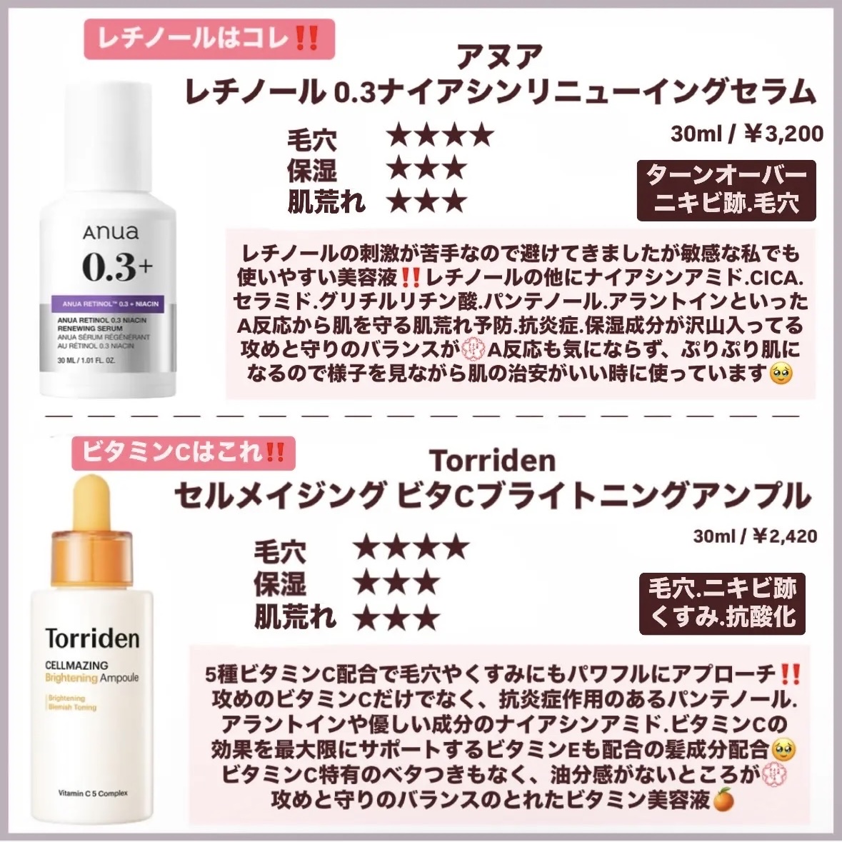 毛穴に打ち勝つおすすめ美容液紹介します🐰 朝夜で1個ずつ買いましょう! おすすめは朝ビタ.夜レチです! 美容液1つでも使うのと使わないのとでは違ってくるので自分に合う商品に出会えるように色々と試してみてくださいね🥹