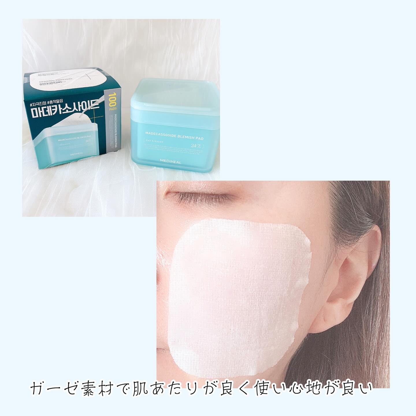 2024 OLIVE YOUNGアワード トナーパッド部門で1位を受賞した MEDIHEAL(メディヒール)のマデカンサイド ブレミッシュパッド✨ 保湿+肌荒れ防止にと1枚でマルチケアのできるマデカンサイド ブレミッシュパッドは、マデカンサイド(ツボクサ2回抽出)+ナイアシンアミド成分でシミ跡や肌トーンupといったくすみケアに特におすすめ🤍 ピタッと肌に密着するガーゼ素材も肌当たりよく肌のキメをなめらかに整えてくれることによりメイクノリも良い感じ🥰