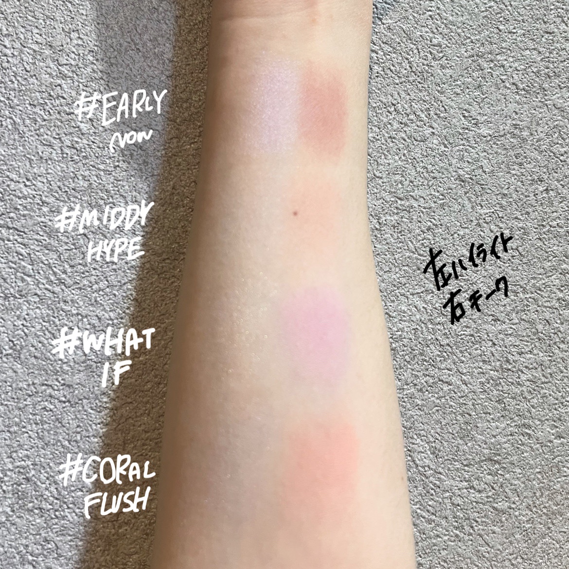 オーロラハイライトとヴェールチークがひとつに! WHAT IF,MIDDY HYPE,EARLY NOW,CORAL FLUSHの4色は反対色で入っていて“盛れツヤほっぺ”に🩷 LAZY TALKとMIDDY HYPEが気に入っています🥰 パケもシンプルで大きさ的にも持ち歩ける◎ 可愛くてお気に入りの製品です💗 これが私の初3CEでした🙂↕️🙂↕️🙂↕️
