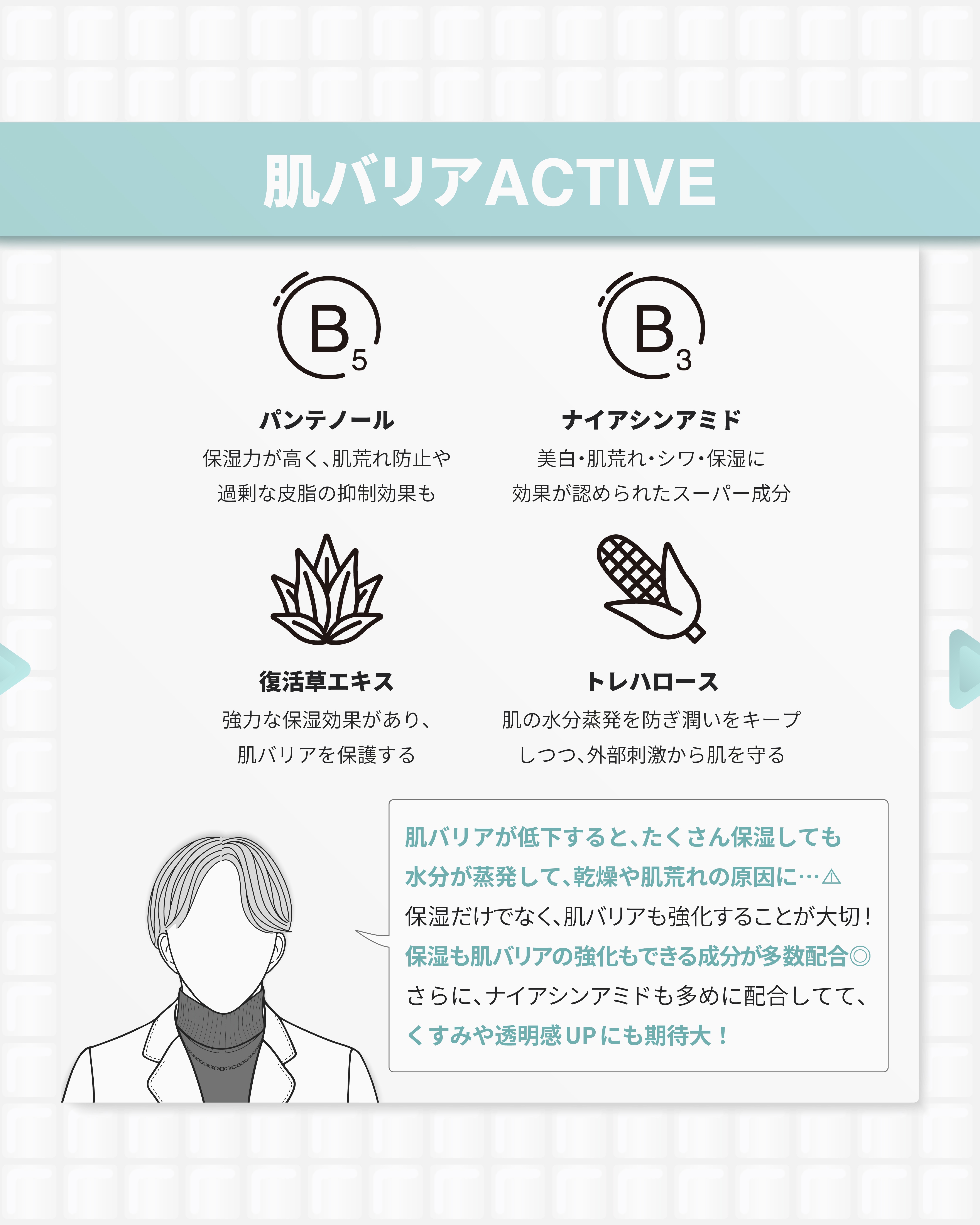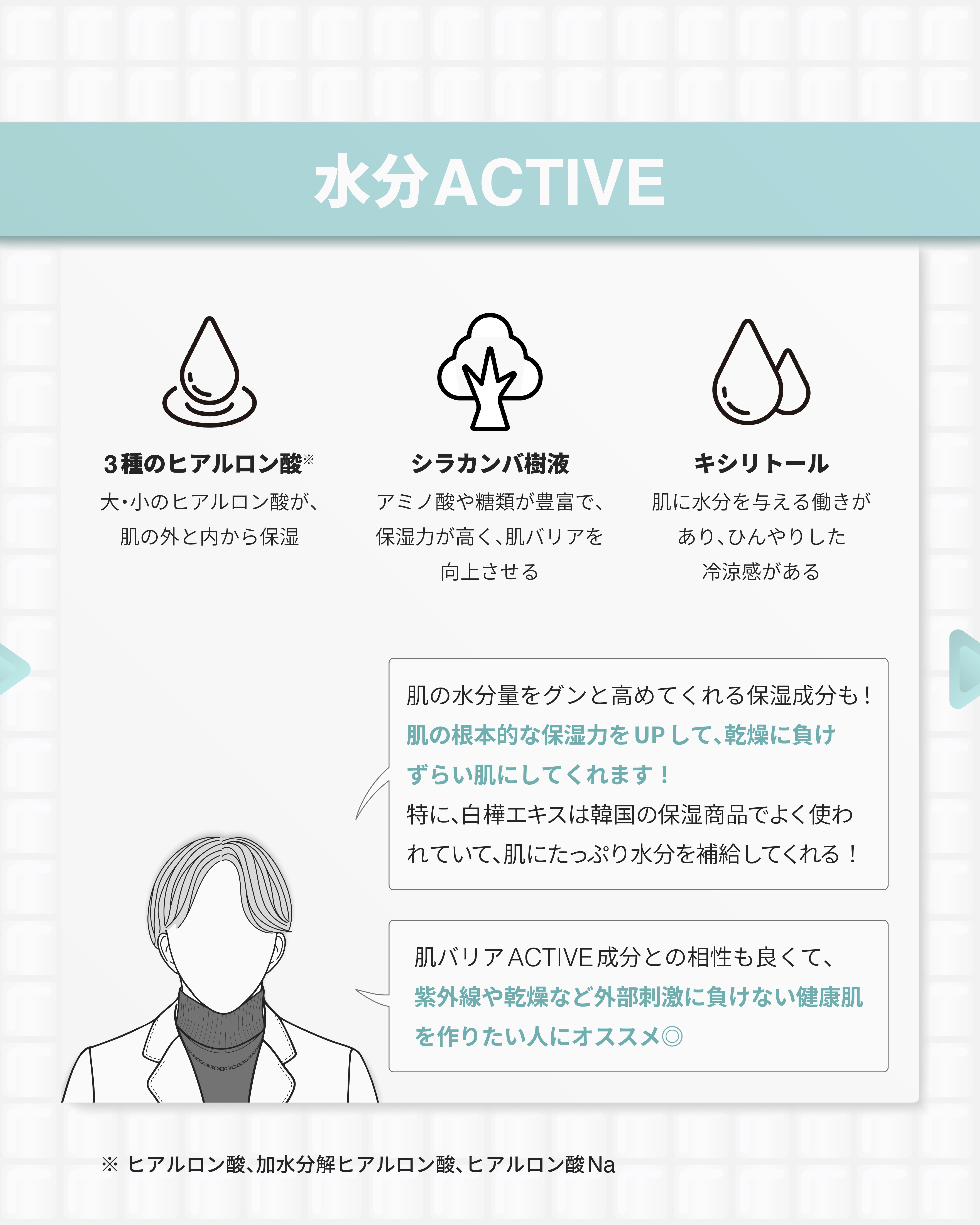 - <50ml> 水、1,2-ヘキサンジオール、グリセリン、ナイアシンアミド、プロパンジオール、カルボマー、トロメタミン、ヨモギ葉エキス、シラカンバ樹液、エチルヘキシルグリセリン、ブタンジオール、アデノシン、アラントイン、EDTA-2Na、トレハロース、キシリトール、パンテノール、アンザンジュエキス、ヒアルロン酸、加水分解ヒアルロン酸、ローズマリー葉エキス、ヒアルロン酸Na