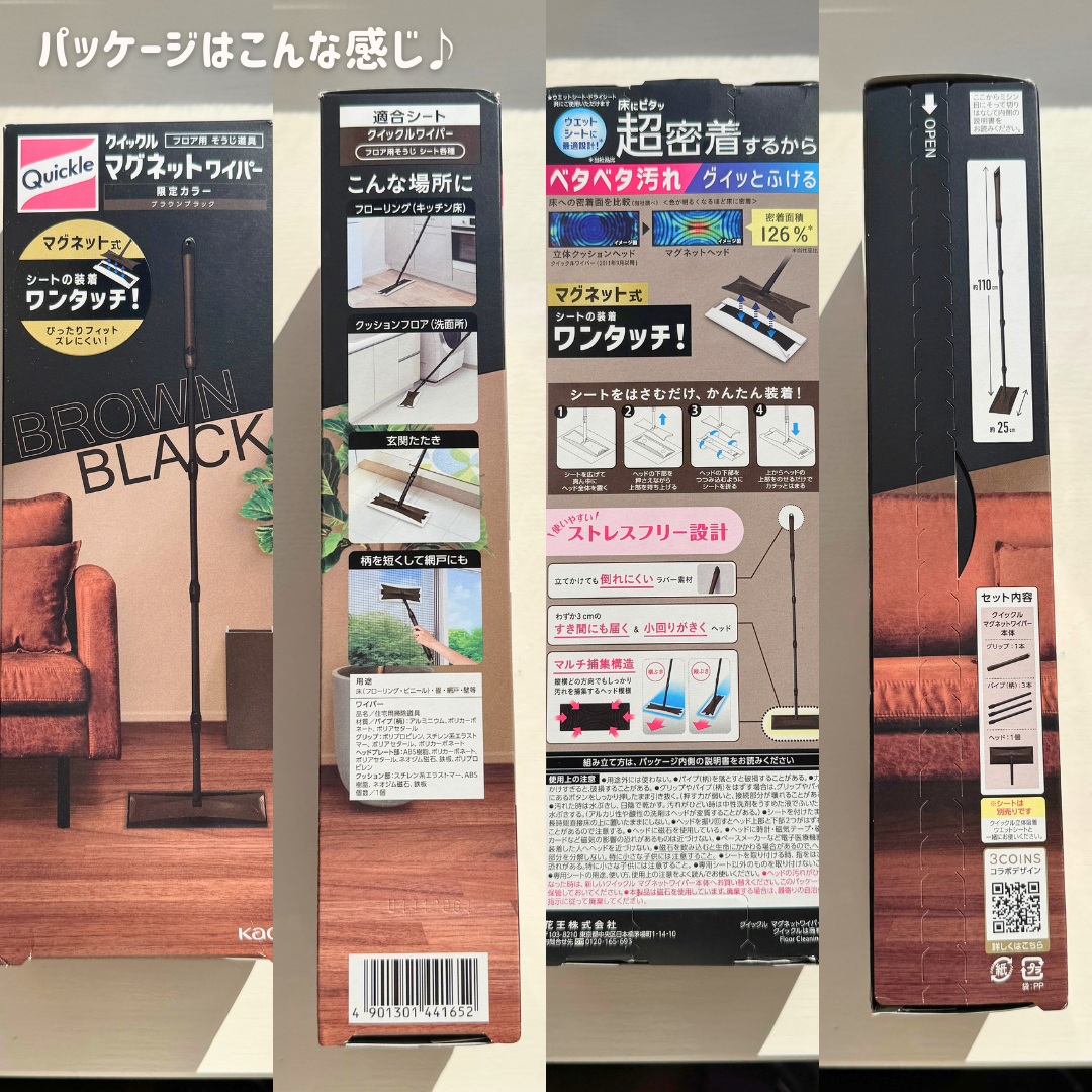 「3COINS」との特別コラボレーションで発売された クイックルマグネットワイパーの限定カラー ブラウンブラックを提供いただきました✨ マグネット式なので、シートの装着がかんたんワンタッチで完了‼️ 磁力でシートを全体的にはさみこむので床を拭いている間もぴったりフィットしてずれにくいのでとても使いやすいです🫶🏻 フローリング(キッチン床)やクッションフロア(洗面所)、玄関たたきにおすすめだし短くして網戸にも使えちゃいます❣️