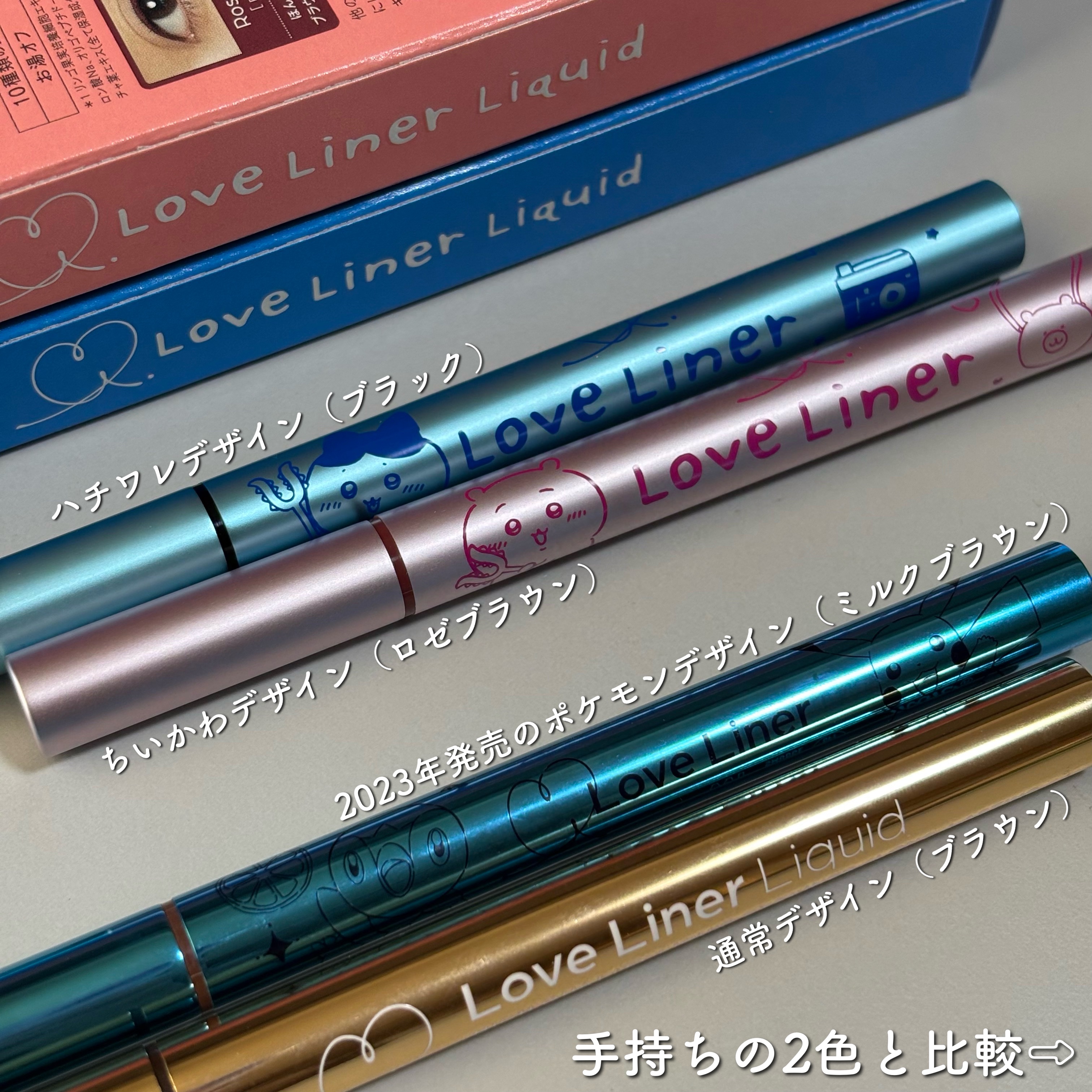 ラブ・ライナー×ちいかわコラボのアイライナー!情報解禁から私得すぎるデザインで発売日に早押し頑張りました(՞˶ᵒ̴̶̷᷄꒳ᵒ̴̶̷᷅ ˶՞)💦 ラブライナーは擦れにも強く滲みにくく、筆先は細くなっていてしなりも良いので機能性はとっても良いところがお気に入り♡ 推しキャラと好きなカラーで交換して持ち歩くのも良いかも🤭 推しのハチうさと好きなモカグレージュで大満足なカラーチョイスだった!