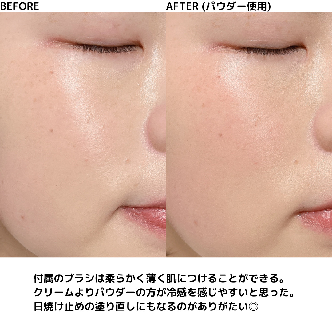 みずみずしいテクスチャーのUVクリーム。塗り広げてみるとするする伸び、うるおい感があって、パサつき感がなく白浮きもしにくい⚪︎ ひんやりさらさらっとした質感に仕上がる冷感UVパウダー。従来品よりもひんやり感がアップ✨ 心地よい冷感で使いやすい。付属のブラシでふわっとナチュラル仕上がりに。さらっとテカリもオフしてくれるのが嬉しい!