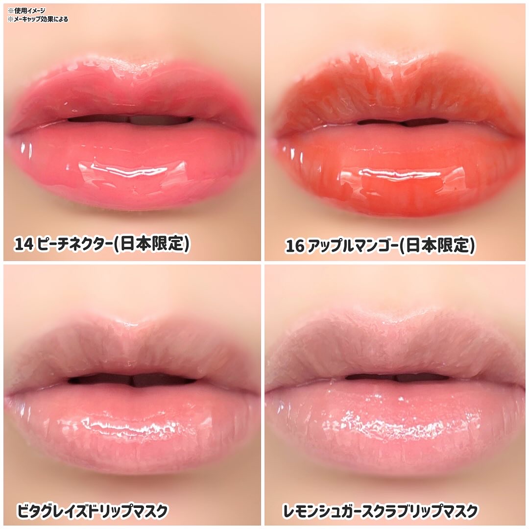ふっくら輝くツヤリップメイク完成✨ 寝ている間に唇の角質を落ち着かせるオーバーナイトリップマスクは デイリーで使える「ビタグレーズド」 スペシャルケアで使える「レモンシュガースクラブ」 リップオイルは今回紹介する日本限定カラー2種の他、計16種類のカラーがあるよー🩷